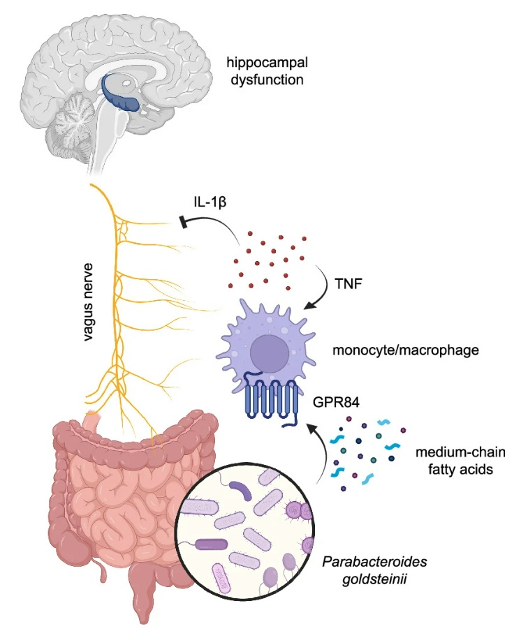 研究揭示了一个完整的分子链条:P. goldsteinii大量分泌3-羟基辛酸、癸酸和十二烷酸等中链脂肪酸,这些物质在老年小鼠肠道内显著积累,且可通过菌群移植传递给年轻宿主。中链脂肪酸通过激活髓系细胞表面的GPR84受体,触发肿瘤坏死因子和白介素-1β等促炎因子释放。这些炎症因子作用于迷走神经感觉神经元上的白介素-1β受体,抑制其信号传导。阻断这一链条的任一环节,均可保护小鼠免受认知损伤。