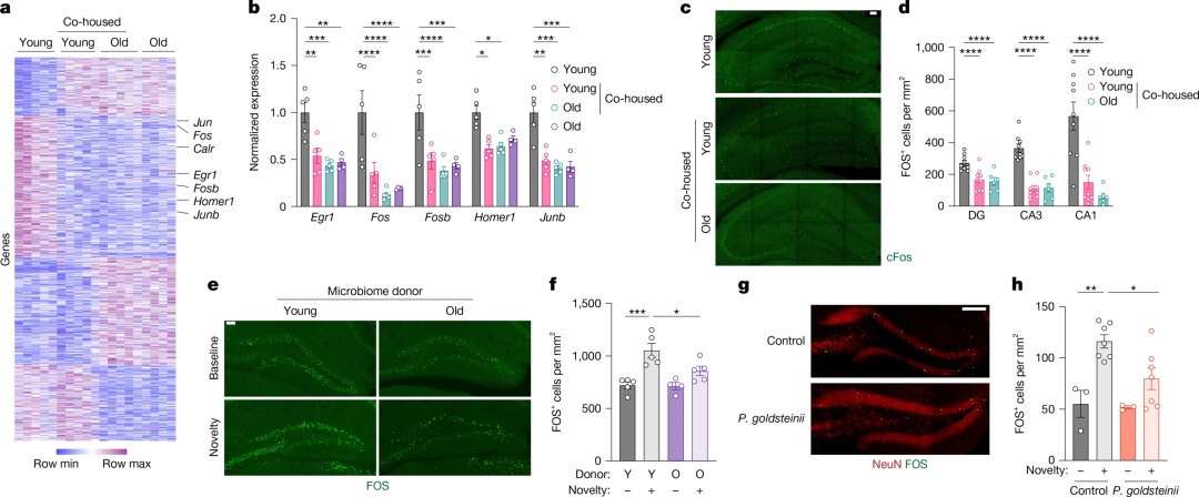 研究团队深入探索了这一信号通路。他们发现,拥有老年肠道菌群的年轻小鼠,其海马体对新奇刺激的反应显著减弱,记忆编码能力受损。这一现象不仅限于海马体,还涉及孤束核、体感皮层和嗅周皮层等多个脑区,表明肠道菌群紊乱可广泛影响大脑的感知处理能力。