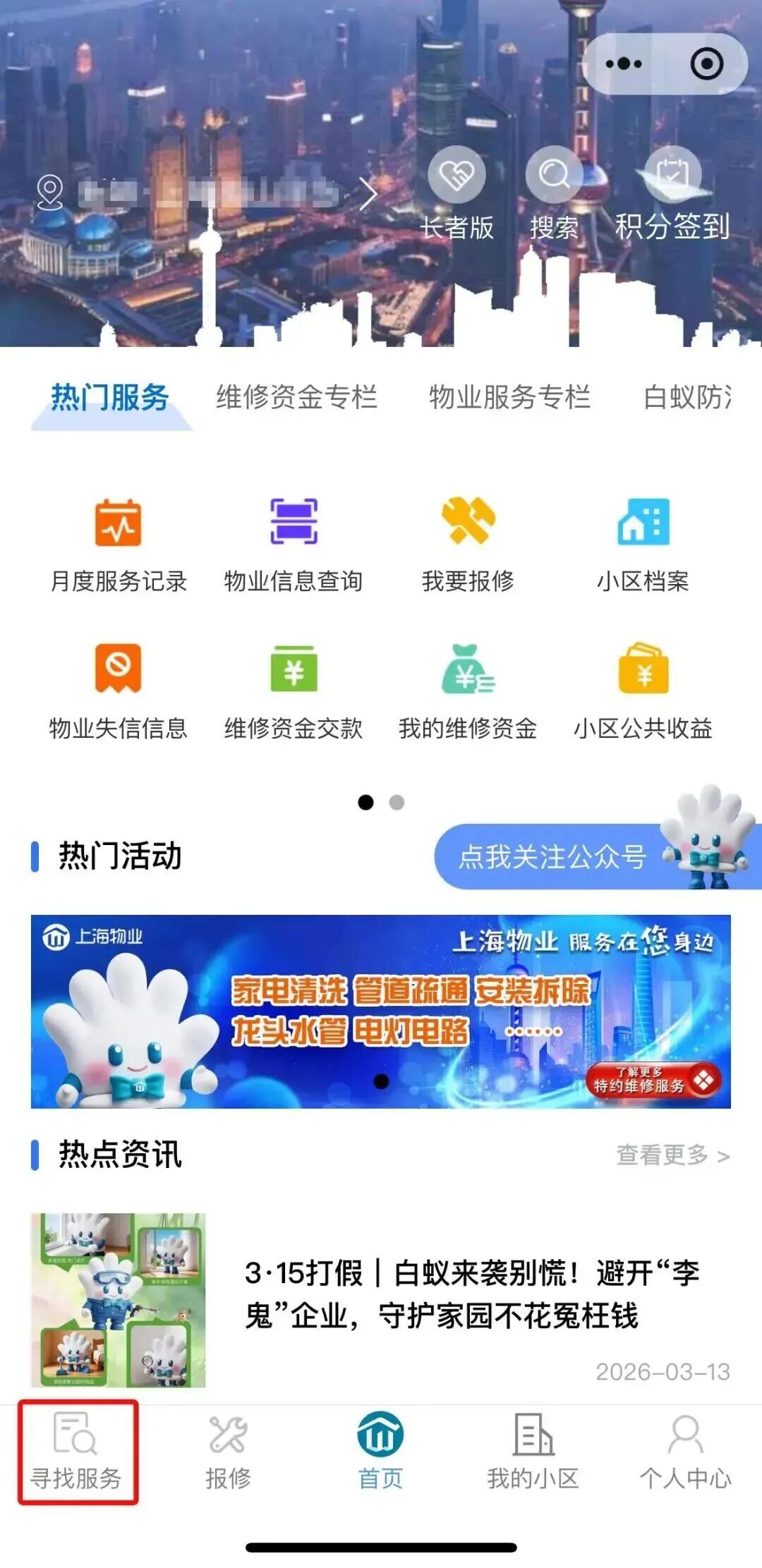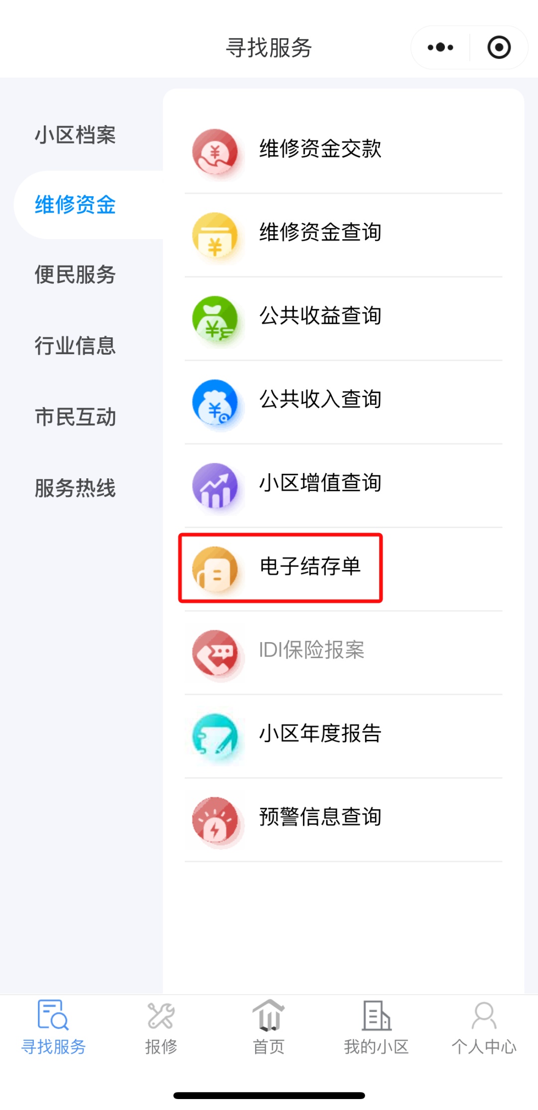 2.打开“上海物业”微信或支付宝小程序,绑定房屋信息后,可在首页“寻找服务”→“维修资金”→“电子结存单”中查询房屋对应的结存单信息。