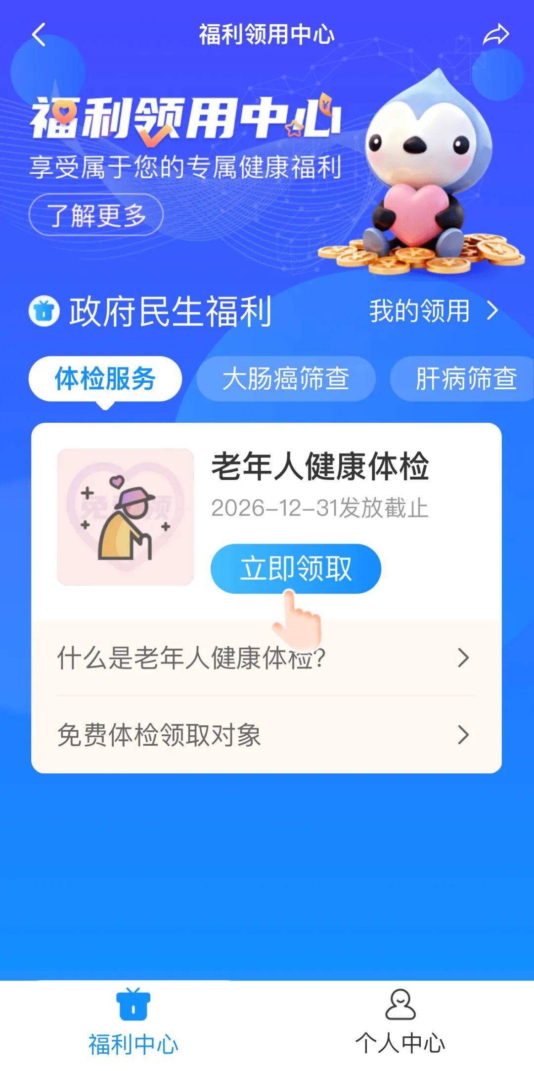 点击【健康福利领用】进入