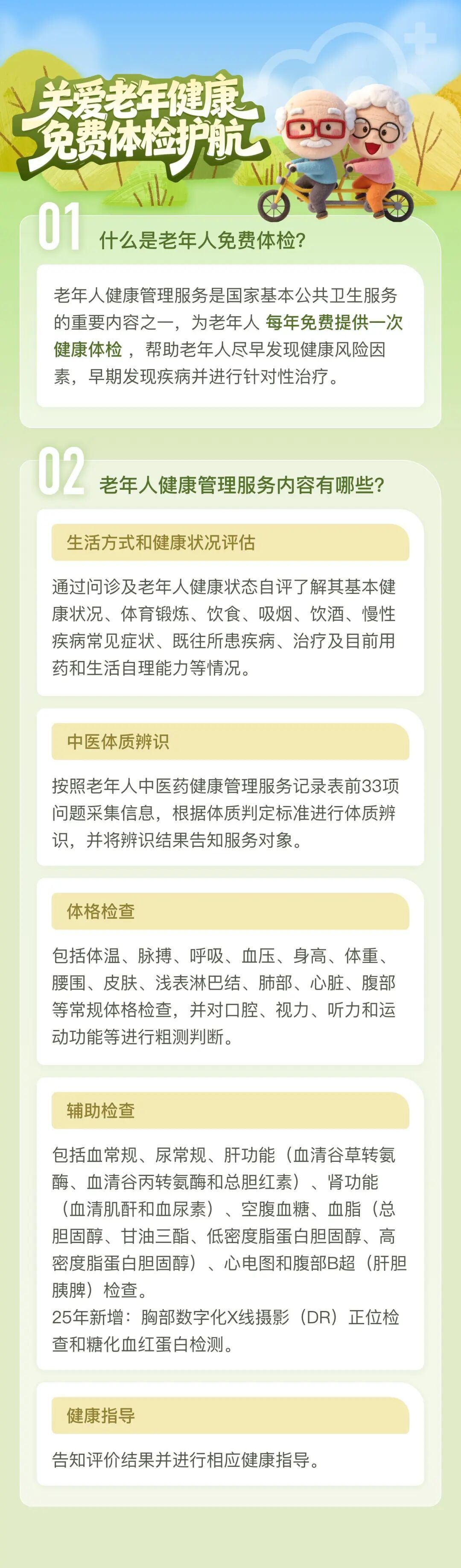 体检内容涵盖生活方式和健康状况评估、体格检查、辅助检查和健康指导等,为每位老年居民提供专业的健康关怀和健康指导。