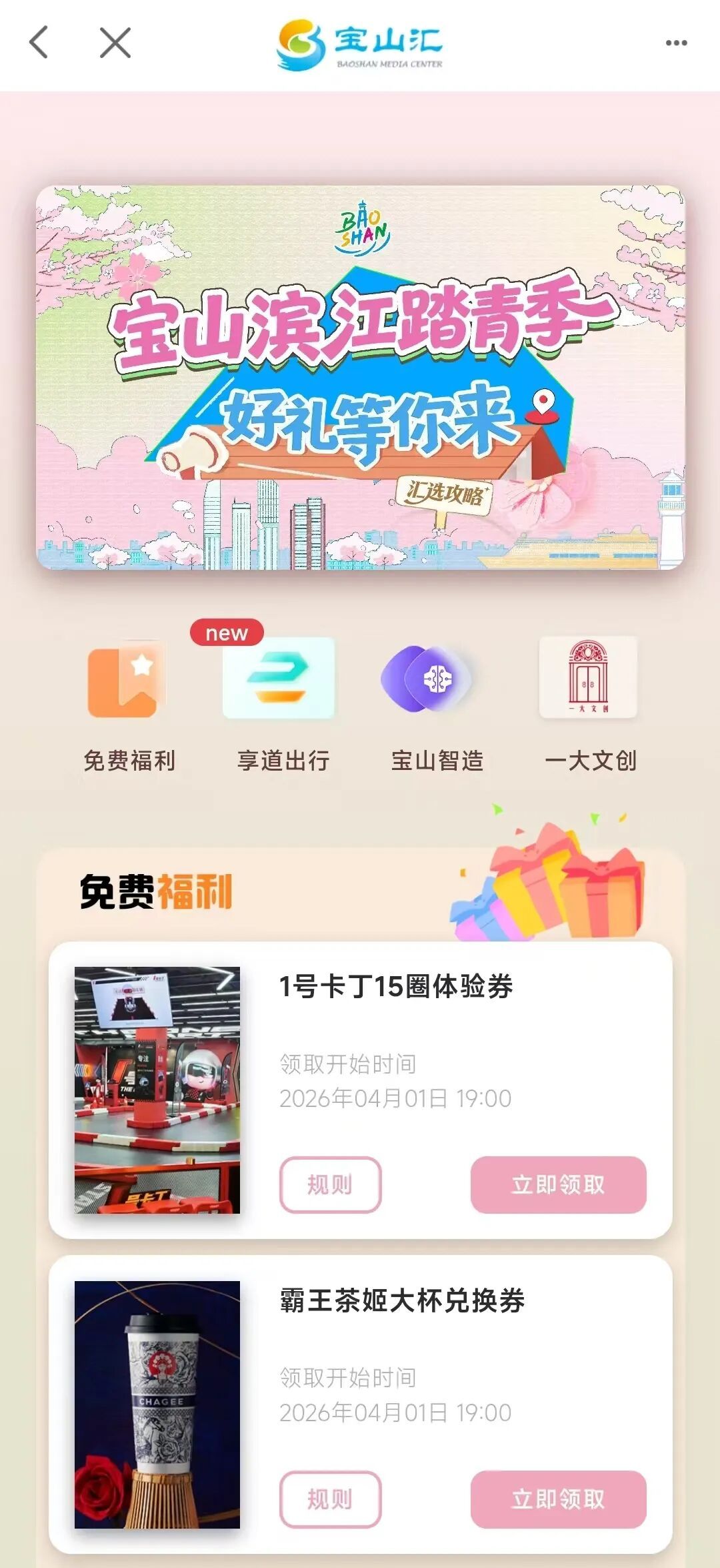 踏青宝山滨江!免费福利上线,1号卡丁15圈体验卷、霸王茶姬大杯兑换券今天19:00开抢→