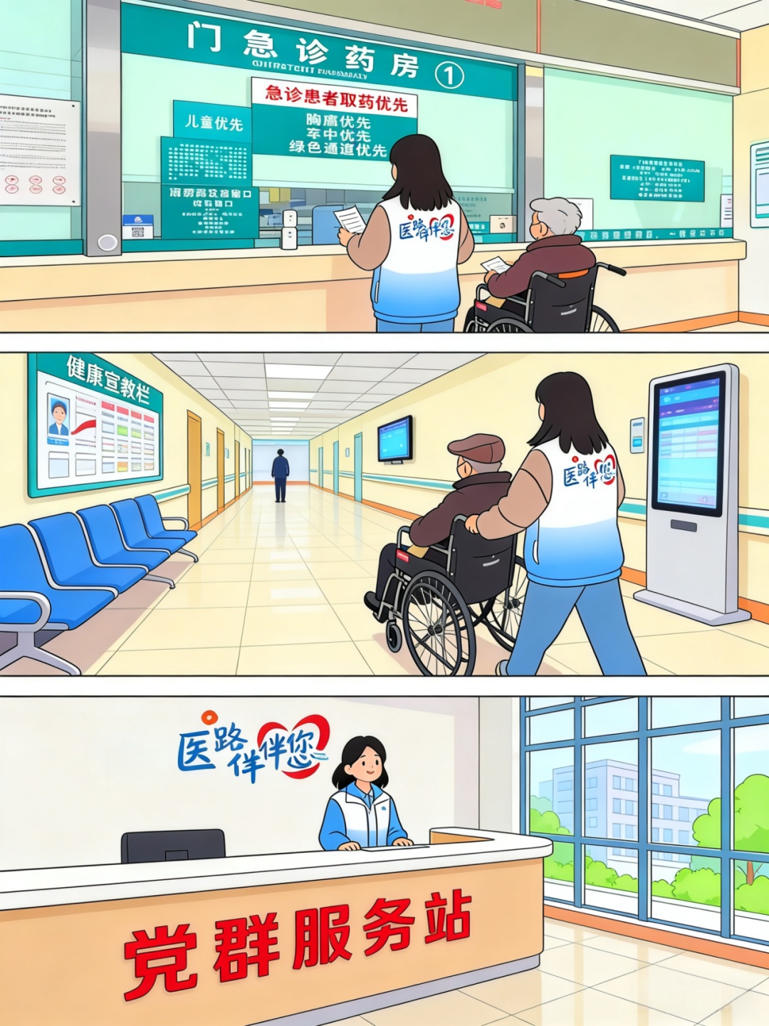 项目概述:“医路伴您”志愿陪诊服务由志愿陪诊员全程陪伴患者完成门诊就医全流程,提供诊前咨询、预检分诊、挂号缴费、陪同就诊、协助检查、取药引导、诊后反馈等服务,重点关爱老年患者、行动不便及有需要的就诊人群。