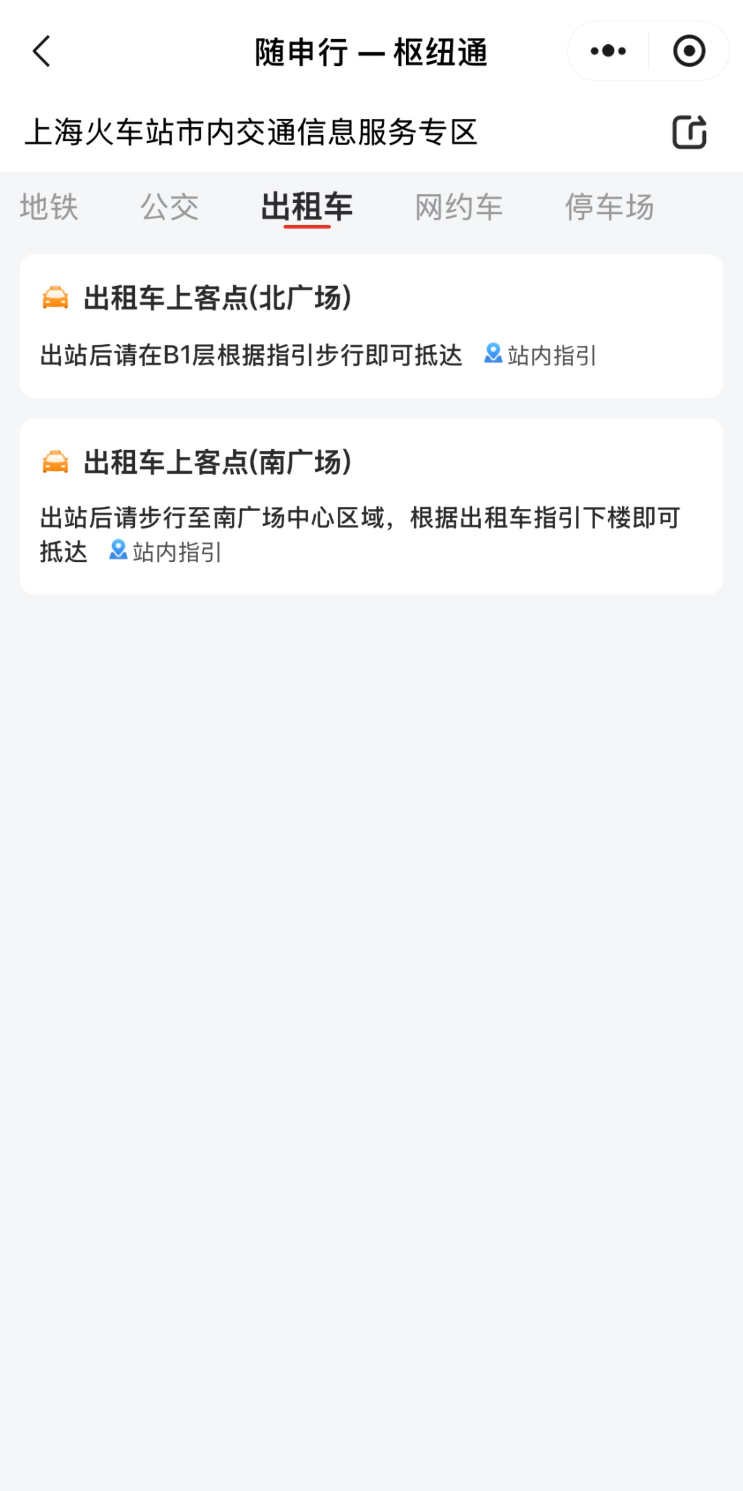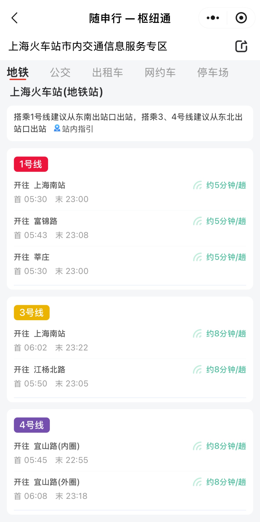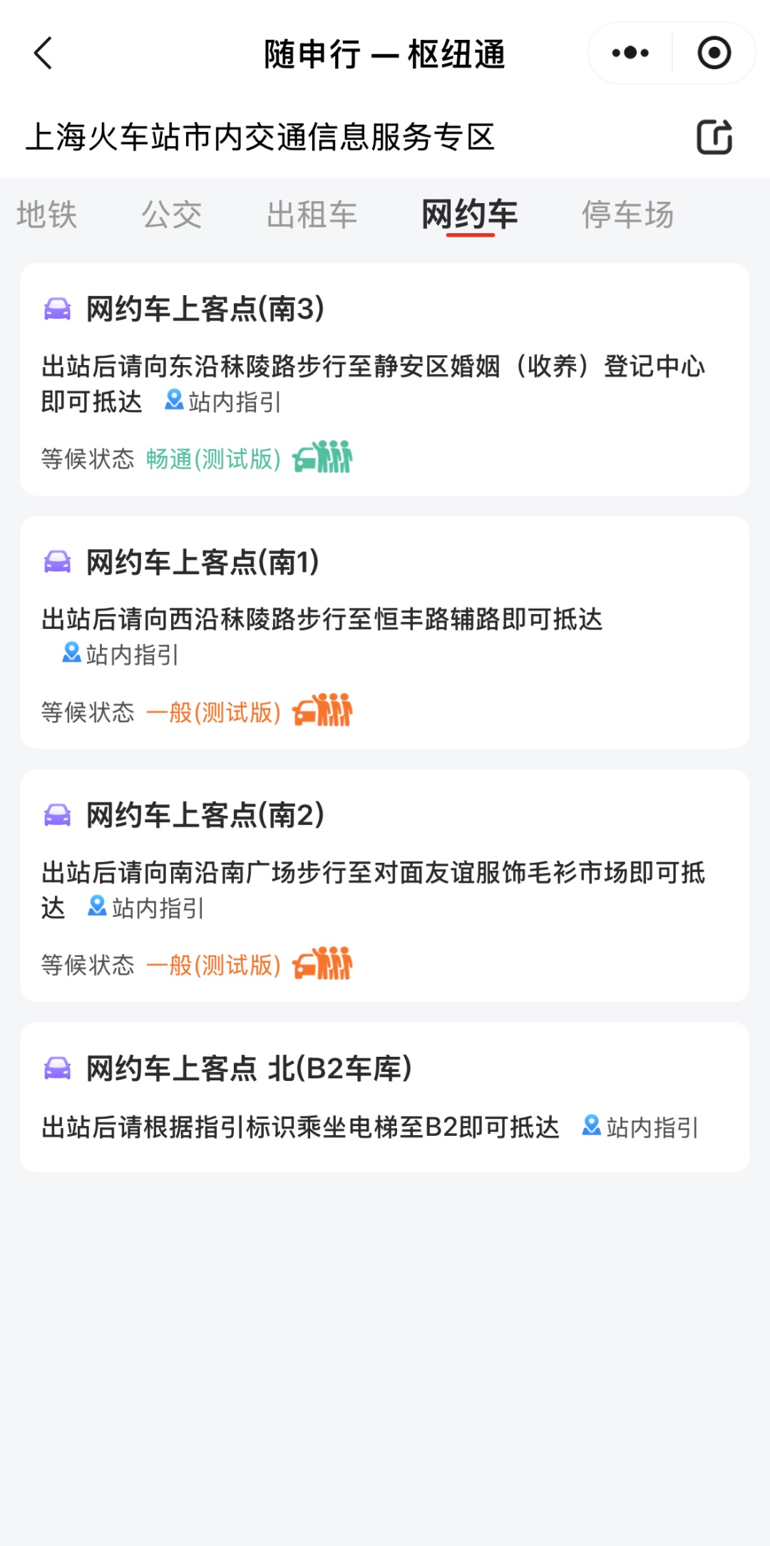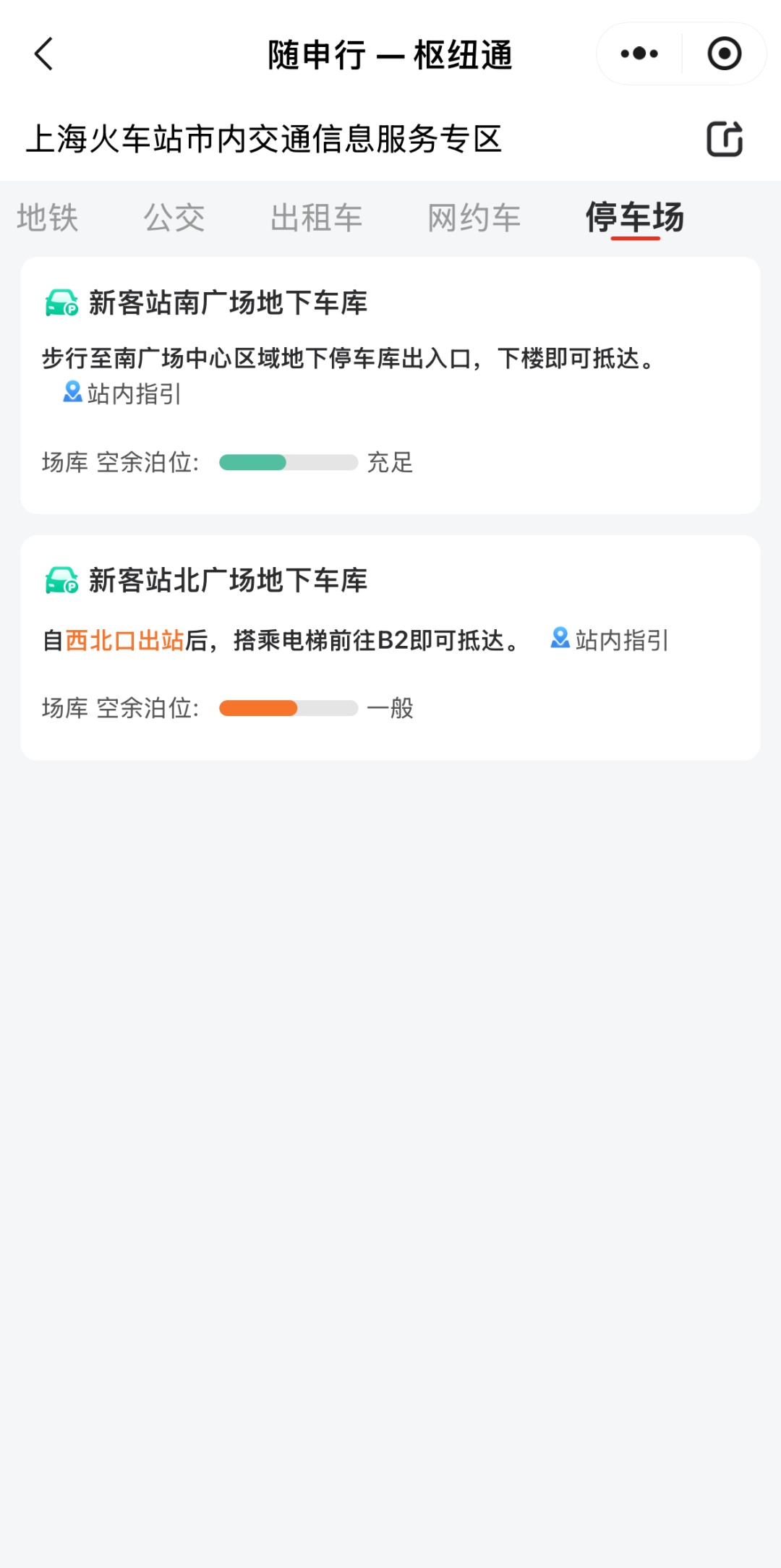 站点选择好后,可直接选择意向交通方式“地铁”“公交”“出租车”“网约车”等查看交通线路情况,有亲朋好友接送的旅客还可以选择“停车场”,进行查看车库空余泊位是否充足。
