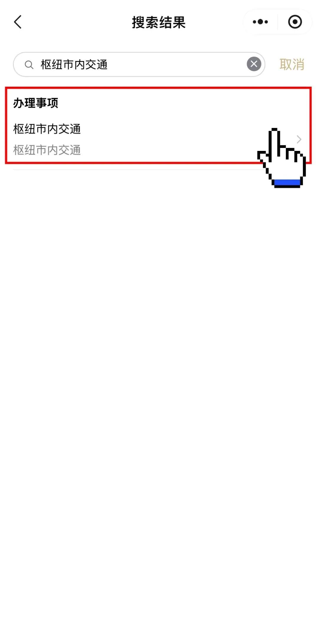 打开“随申办市民云”(APP/微信小程序/支付宝小程序),首页搜索栏输入「枢纽市内交通」,并点击进入专区。
