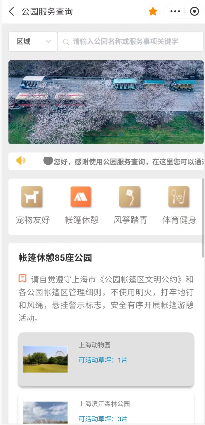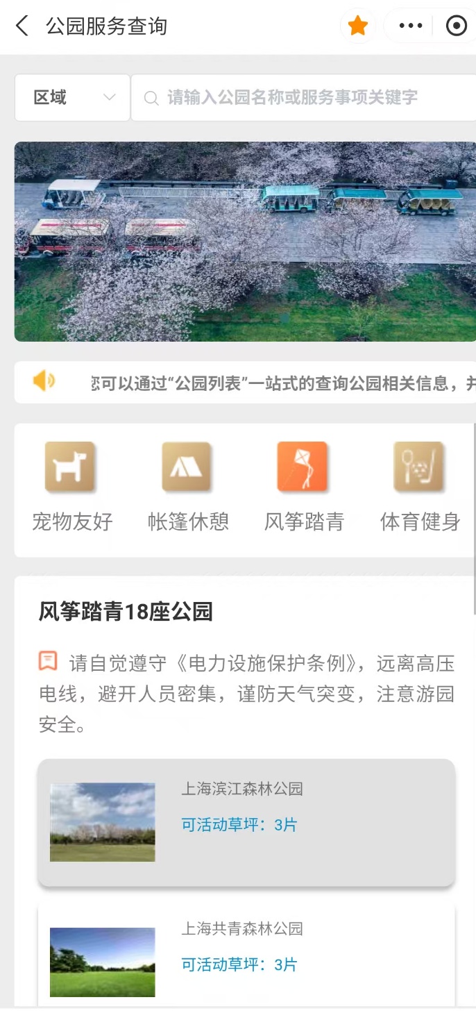 服务收录的公园已按功能类别进行划分,大家可以根据出行需求选择具有【宠物友好】、【帐篷休憩】、【风筝踏青】、【体育健身】等功能的公园。