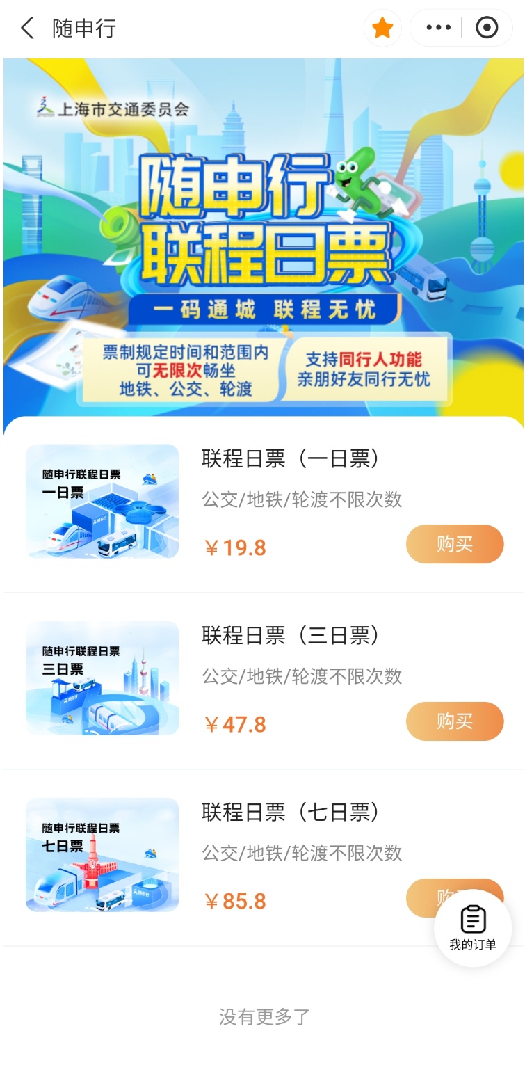 三种“联程日票”自由选择:19.8元一日票、47.8元三日票、85.8元七日票。(可免费在票制规定时间和范围内无限次畅坐地铁、公交、轮渡。)