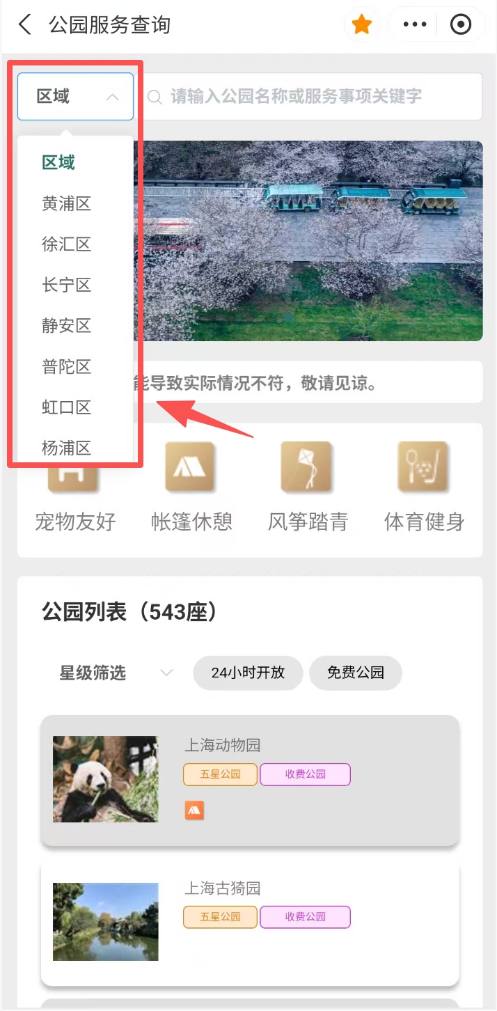 服务整合了全市543座城市公园信息,市民可以随时随地查询、了解公园的位置、开放时间、公园历史、景观特色等信息,并根据区域、星级、24小时开放、免费公园等标签筛选查合适的打卡地。