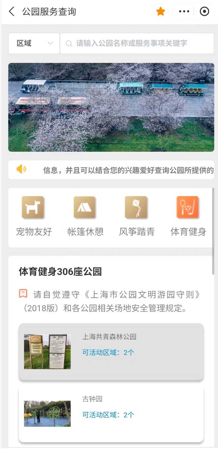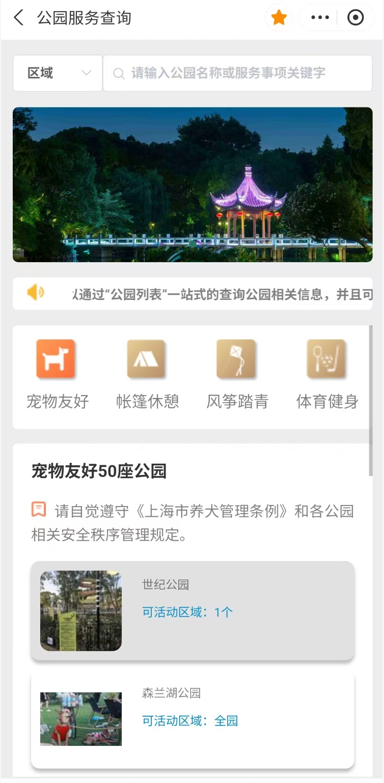 打开“随申办市民云”(APP/微信小程序/支付宝小程序),首页搜索关键词“公园”,找到“公园服务查询”查一查。