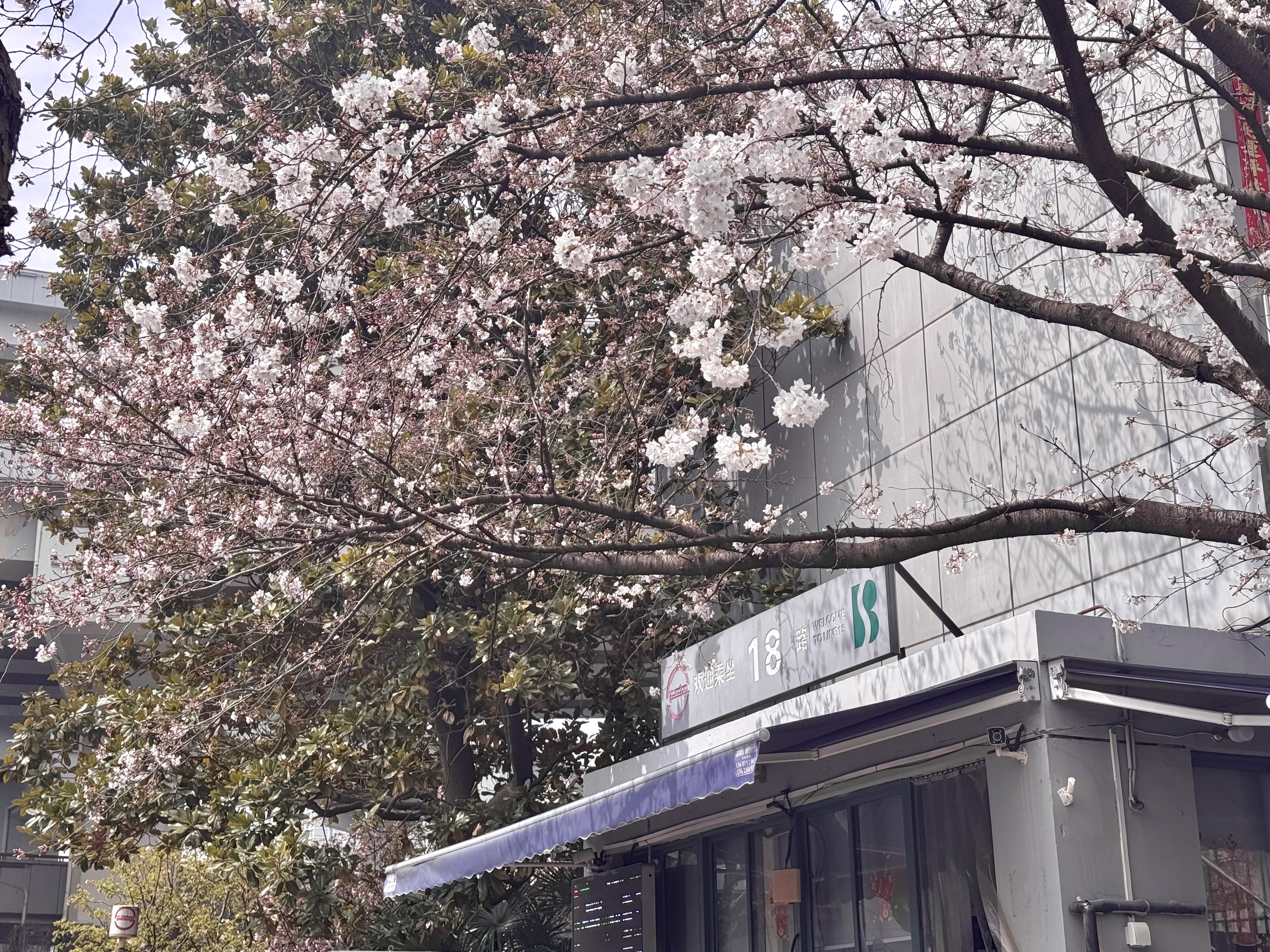 沿着18路公交继续前行,往鲁迅公园方向坐上几站,便来到了东江湾路同心路。这里的樱花与南浦大桥公交站的热闹截然不同,呈现出一种静谧之美。树影婆娑间,花瓣悠悠飘落,有的落在公交站牌上,有的铺在路面上,温柔又治愈。这里没有南浦大桥公交站的人潮涌动,更多了一份市井烟火气。市民们可以慢悠悠地在这里散步,静静地欣赏樱花,感受春天的气息。偶尔,一辆18路公交车缓缓驶来,车轮轻轻碾过落樱,仿佛时间都在这一刻静止,春日的美好被定格。
