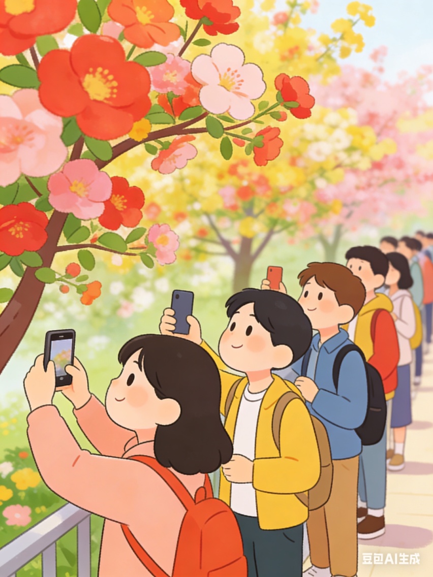 拍照打卡时相互礼让,不占用公共通道,不攀爬树木、雕塑,遵守景区秩序,让美好瞬间定格在文明举止中。
