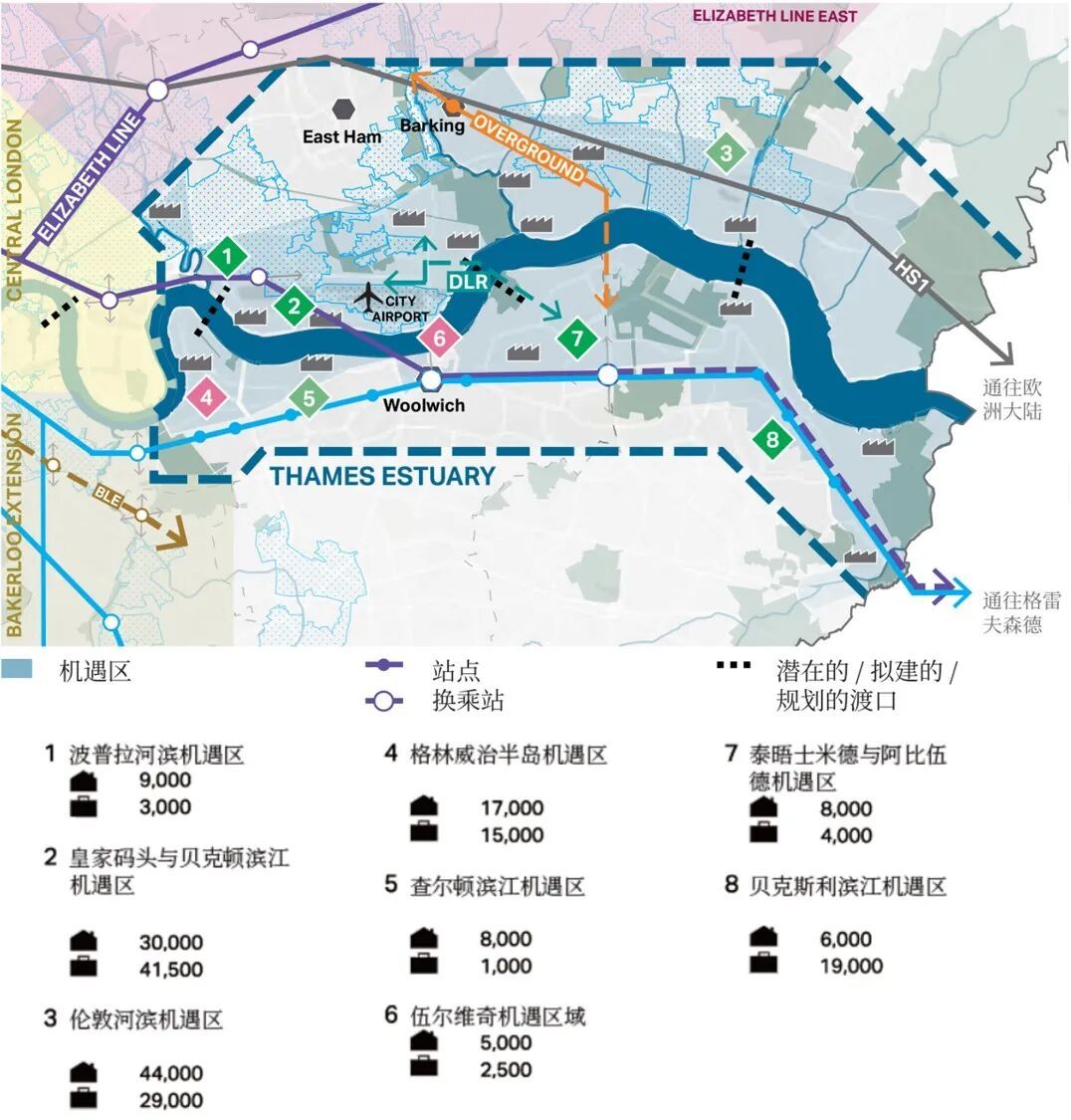 从跨伦敦与周边郡县的整体尺度看,泰晤士河口地区被认为具备提供约25万套以上新增住房和约20万个新增就业岗位的潜力。相关规划与战略文件提出,将该区域打造为先进制造、清洁能源和生产型创意产业的重要承载区,通过布局大型生产基地和产业平台,促进就业创造、技能提升和区域复兴。