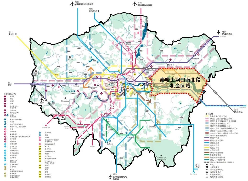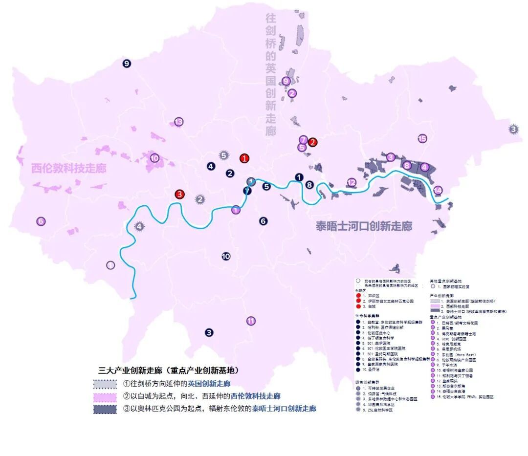 泰晤士河口创新走廊:以奥林匹克公园为起点,沿泰晤士河向东延伸至埃塞克斯和肯特,重点推动棕地和前工业区向文化创意产业区和绿色产业区转型,是伦敦实现区域一体化发展的重要创新轴带。