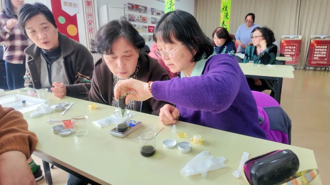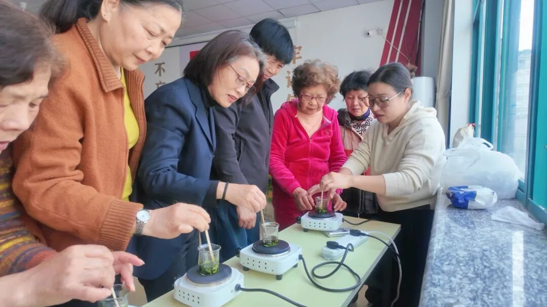 制作环节,大家分组围坐,按比例加入天然蜂蜡、艾草与薄荷精油,小火加热搅拌,最后将熬好的膏液倒入罐中等待凝固。一罐罐翠绿色的薄荷膏陆续成型,居民张阿姨笑着说:“又学了一门手艺,这个夏天不怕蚊子了,这才是过清明的感觉!”