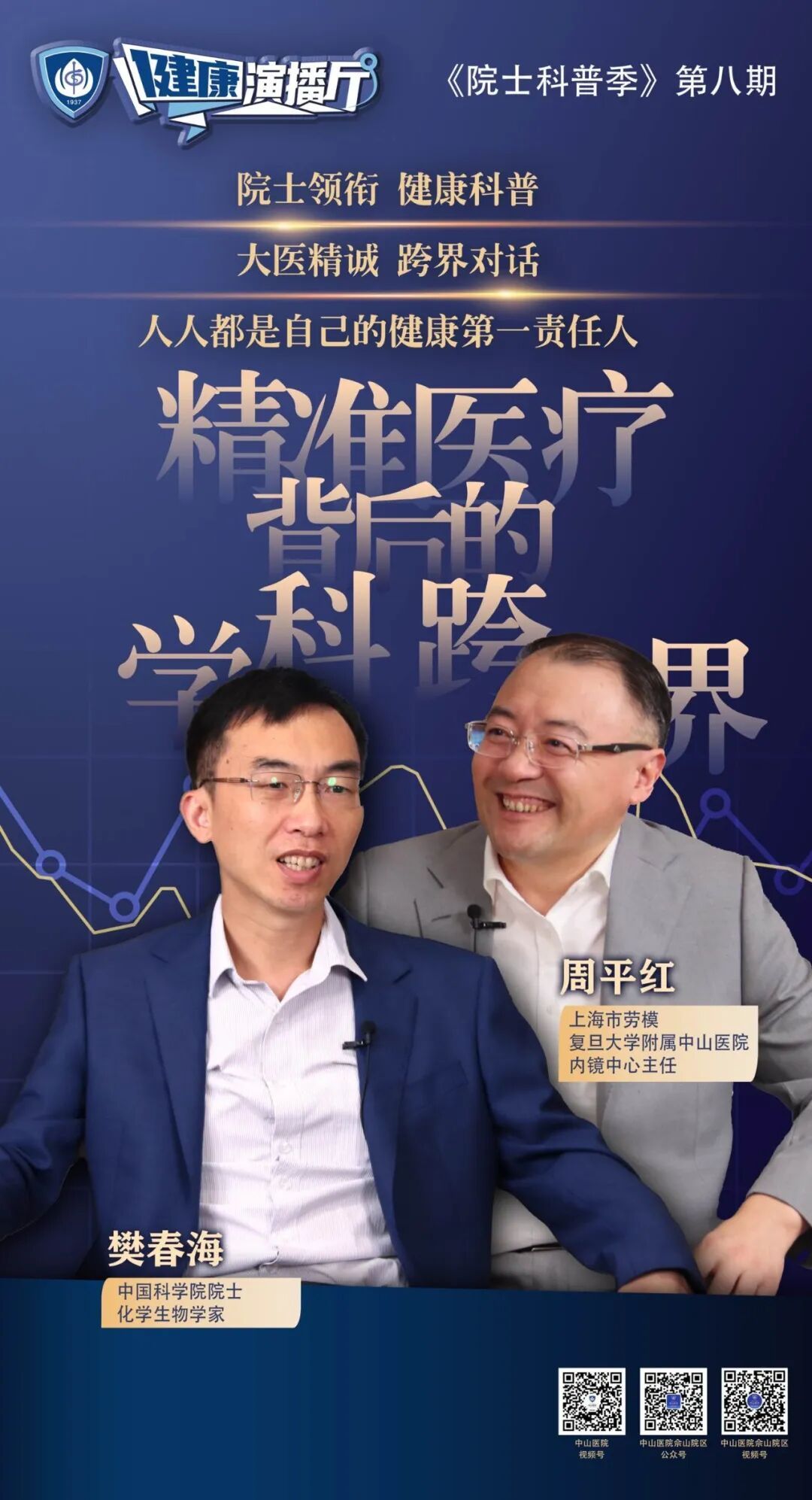 本期节目以《精准医疗背后的学科跨界》为主题,邀请化学生物学家、中国科学院樊春海院士、复旦大学附属中山医院内镜中心周平红主任共话“医学+X”的无限可能。