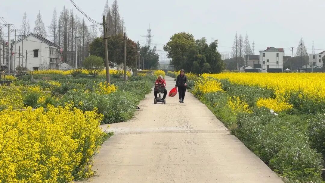 走进新元村,一大片无边无际的油菜花映入眼帘,金浪翻涌,清香漫溢。白墙黛瓦的农舍错落嵌在花海间,一湾碧水绕村而行,石拱桥静卧清波,倒影随波轻晃。田埂蜿蜒,水声潺潺,勾勒出一幅清新的春日画卷。行走其间,既能感受到田园风光的自然野趣,也能窥见乡村改造后整洁雅致的新面貌。