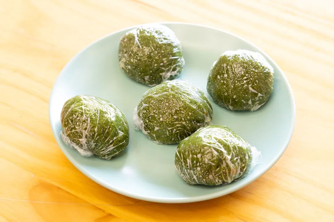 赵建英将艾草仔细洗净,倒入沸水焯去涩味,捞出来立马用冷水冲凉,挤干水分后加入小苏打,榨成细腻的艾草泥,“这样处理后的艾草,才能让青团的颜色鲜绿好看,吃起来也软糯适口。”