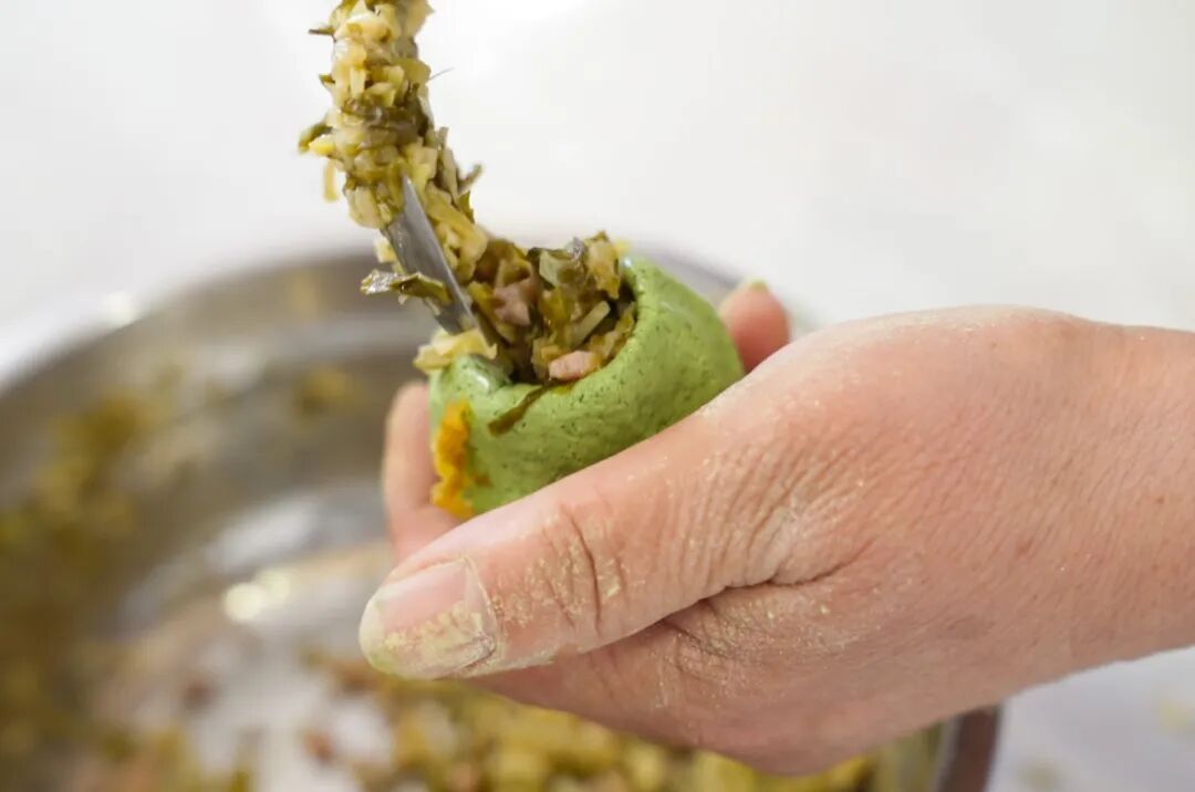 趁着面团醒发,赵建英开始准备馅料。嘉定人偏爱咸口,咸菜笋丁咸肉馅是家常味道的代表。咸肉切丁、春笋焯水切丁,起锅烧油翻炒,再加入麻油、酱油调出咸香。面团醒发好后,分成均匀的小份,捏成窝窝状,舀上满满馅料,收口滚圆。水开上锅蒸上十分钟,蒸好的青团表面薄刷一层玉米油,便油亮亮的了。