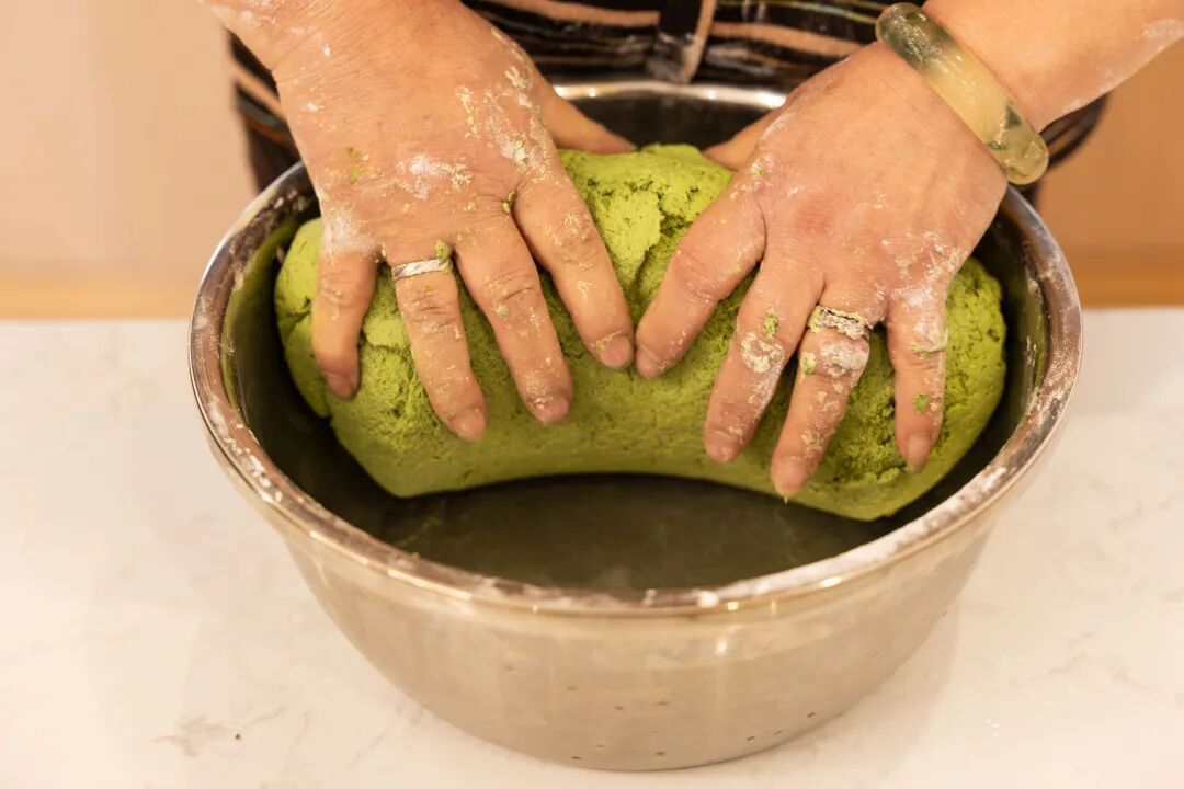 接着,赵建英将艾草泥与糯米粉、澄面一同揉进温水,等粉和水初步融合,“揉面不能心急,得把力气用到面里,反复折叠、按压,让艾草泥和面粉彻底交融。”随后,她将揉好的面团盖上保鲜膜静置醒发,静待它变得更加柔韧。