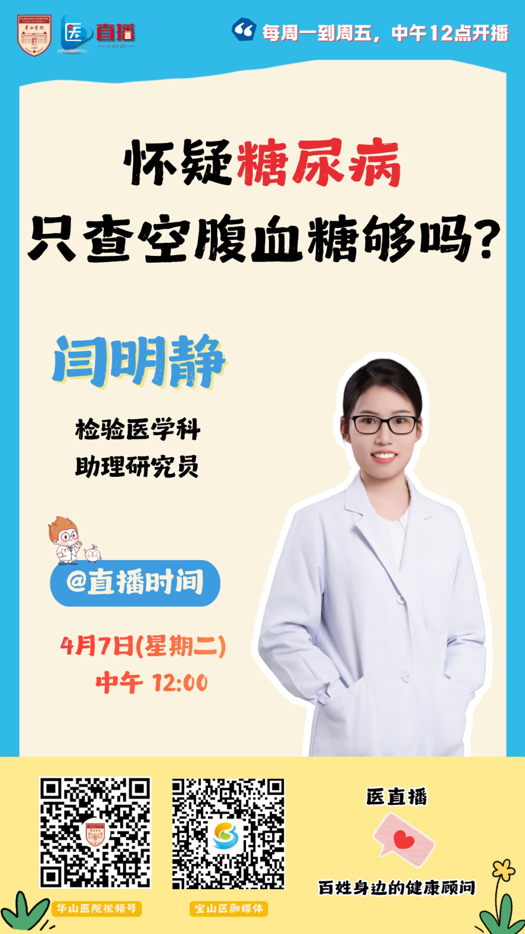 “明明空腹血糖在正常范围,怎么还是查出了糖尿病?”“在家测的指尖血和医院抽的血,结果差了一大截,到底该信哪个?”这些困惑,您是否也有过?高血糖的诊断远不止“空腹测一次”那么简单。很多人的血糖问题其实藏在餐后或糖化血红蛋白里,单看空腹血糖,很可能让“隐形高血糖”悄悄溜走。作为检验医学科的医生,我将带您走进血糖检测的“幕后”——从指尖血与静脉血的区别,到空腹血糖、餐后血糖、糖化血红蛋白等指标各自的意义,再到如何看懂那份满是箭头和数字的报告单。让您不仅能“测对”血糖,更能“读懂”自己身体的真实信号。本期医直播,复旦大学附属华山医院检验医学科助理研究员闫明静,与您一起探讨:怀疑糖尿病,只测空腹血糖真的够吗?