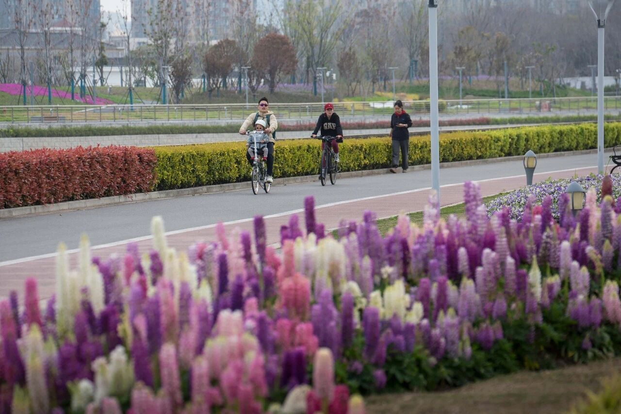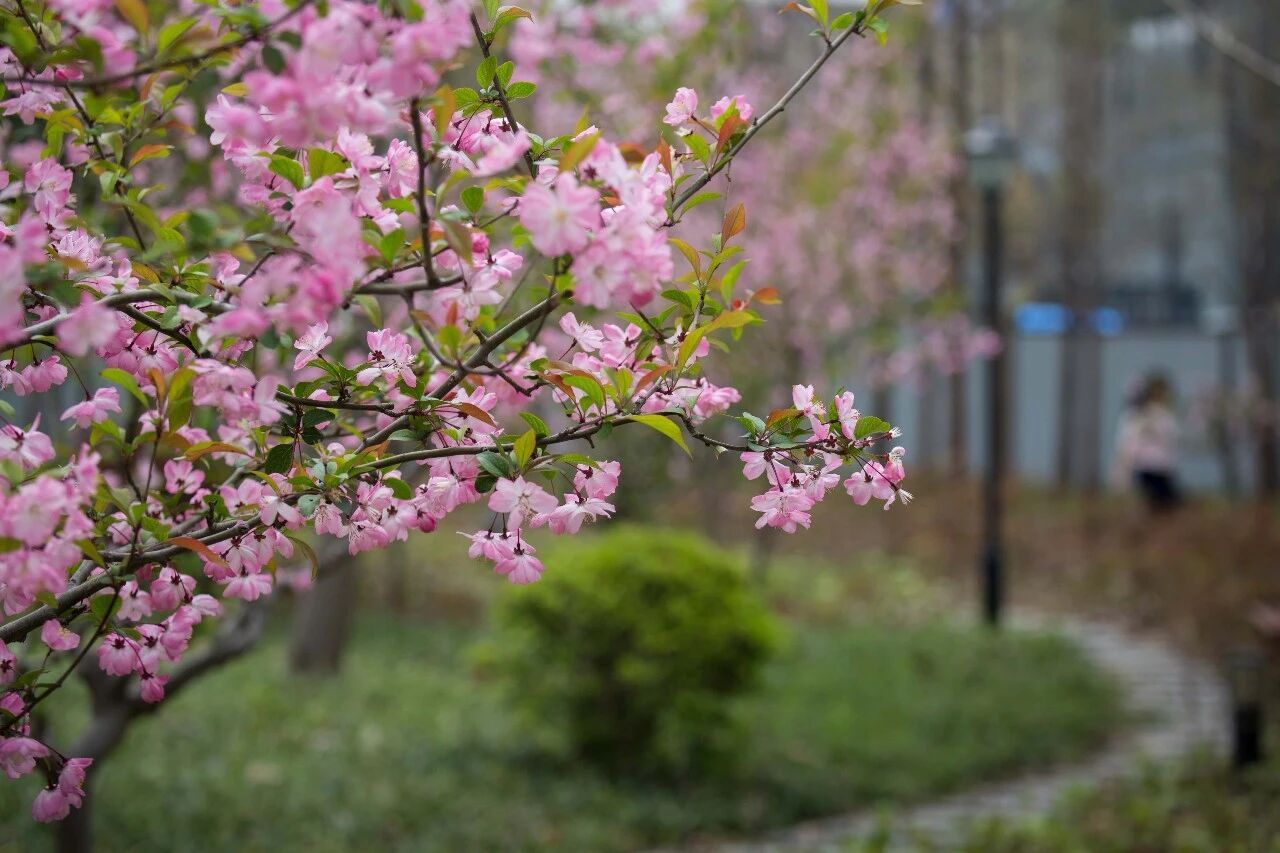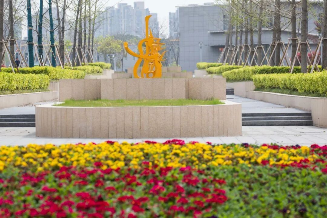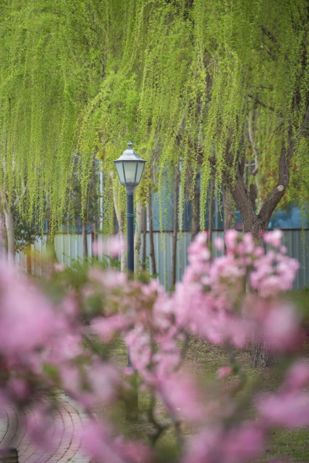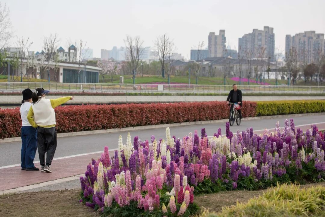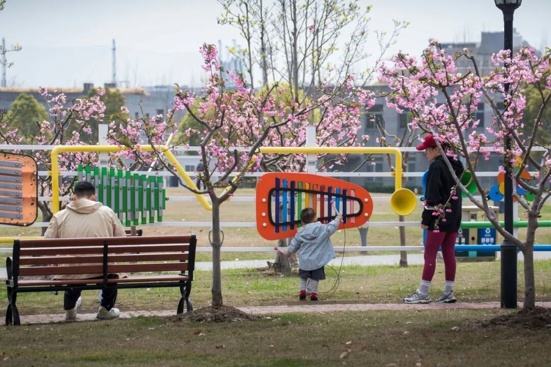 走进公园,春意扑面而来。樱花缀满枝头,微风过处,花瓣轻扬如雨;海棠垂露般簇簇垂落,粉艳欲滴;桃花迎着暖阳舒展嫣红,点亮枝头。沿路花坛中,紫、粉、黄、白相间的鲁冰花亭亭玉立,花穗层层叠叠,与新绿枝叶相映成趣,勾勒出一幅色彩斑斓的春日画卷。园内音乐主题元素与自然景观有机融合,人文与生态相得益彰。