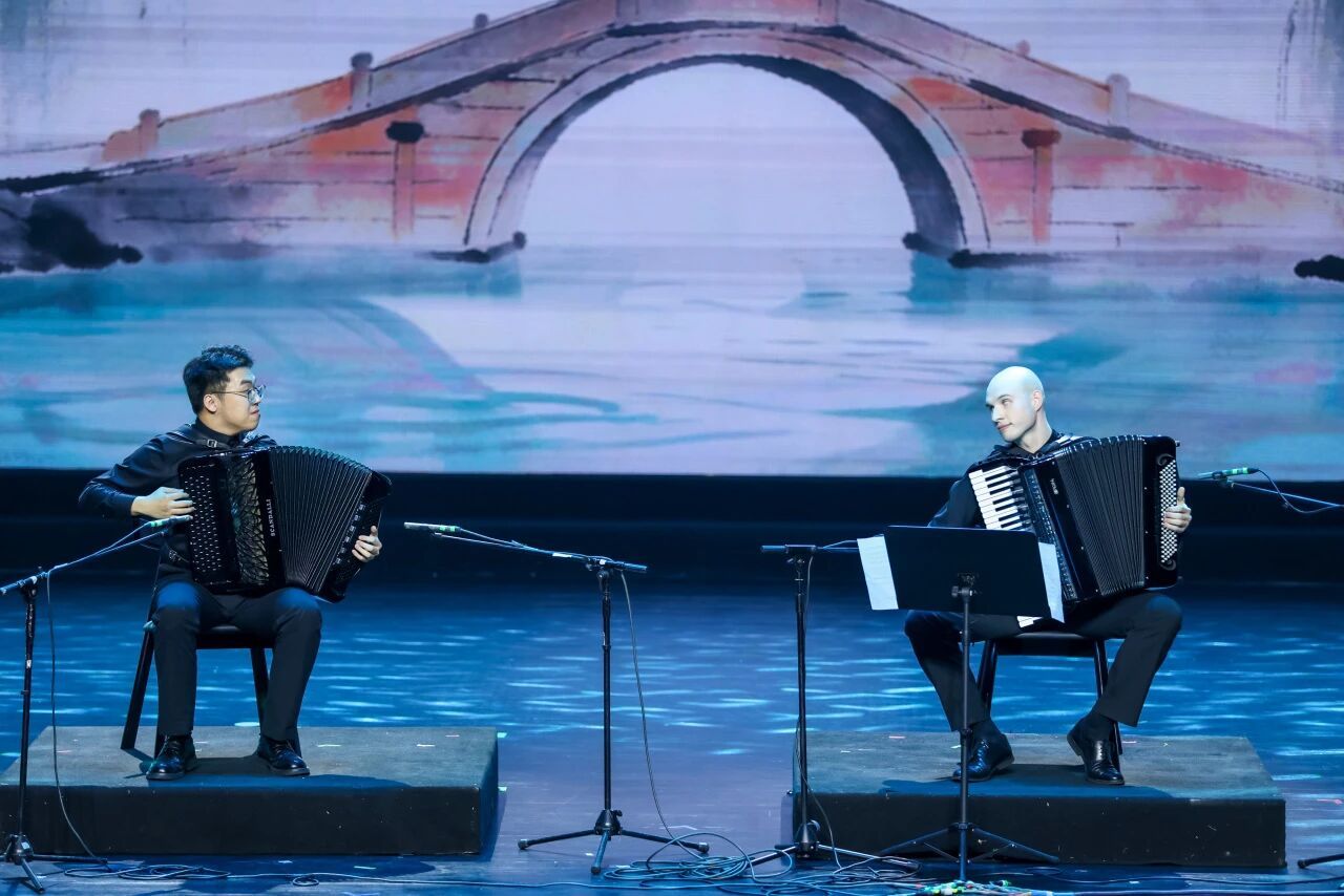 紧随其后,2025年世界杯手风琴锦标赛流行音乐组冠军、摩尔多瓦演奏家列夫·索罗莫诺维奇,用《快走吧,杰克!》《婚礼舞曲》带来爵士与民族风情的双重体验,热情奔放的演奏让现场节奏瞬间升温。而上海本土青年演奏家封景锐、施乾浩组成的“景浩二重奏”,则以一曲《吉卜赛女孩》展现中国青年的演奏实力,指尖的琴声演绎出浓郁的异域风情。更令人惊喜的是,列夫·索罗莫诺维奇专程学习了中国经典曲目《江南好》,并与封景锐同台合奏,中西艺术家携手将江南水乡的温婉意境娓娓道来,成为当晚跨文化交流的暖心亮点。