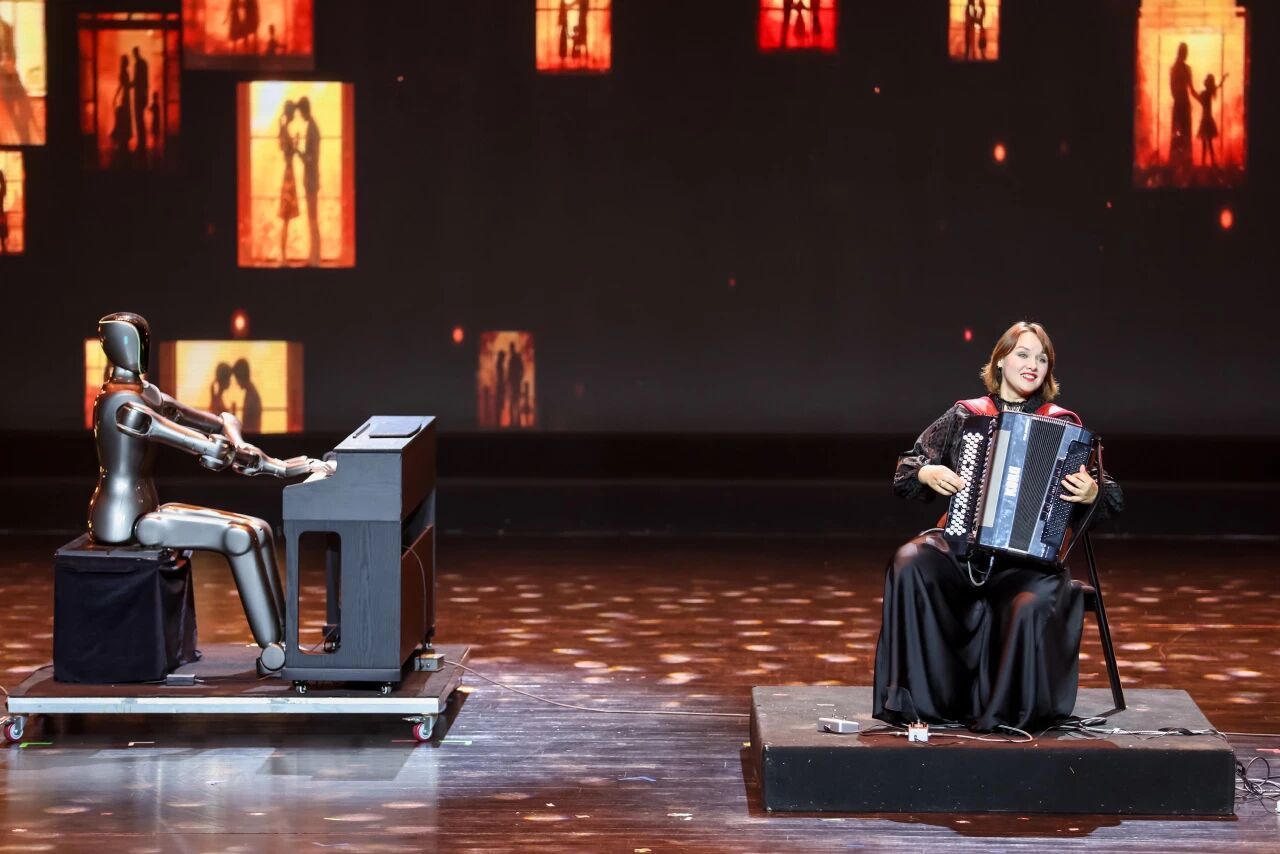 科技与艺术的融合,成为当晚盛典的一大创新亮点。俄罗斯演奏家塔季扬娜·利祖诺娃用电子手风琴带来《时光织梦》,打破传统乐器的听觉边界,让音乐从“聆听”延伸到“看见”与“感知”,巴洛克风格的宏伟、俄罗斯音乐的抒情、圆舞曲的典雅,在电子手风琴的演绎中融为一体,搭配极具想象力的舞台表达,让观众沉浸式感受科技赋能艺术的无限可能。专程从苏州赶来的手风琴爱好者王女士难掩激动:“关注上海之春手风琴艺术周很久了,这次特意提前订了车票过来,没想到现场的精彩远超期待。一场演出中既有传统手风琴,还有电子手风琴,更有中西艺术家同台演奏,每个节目都让我感受到手风琴艺术的无限魅力,路费没白花!”