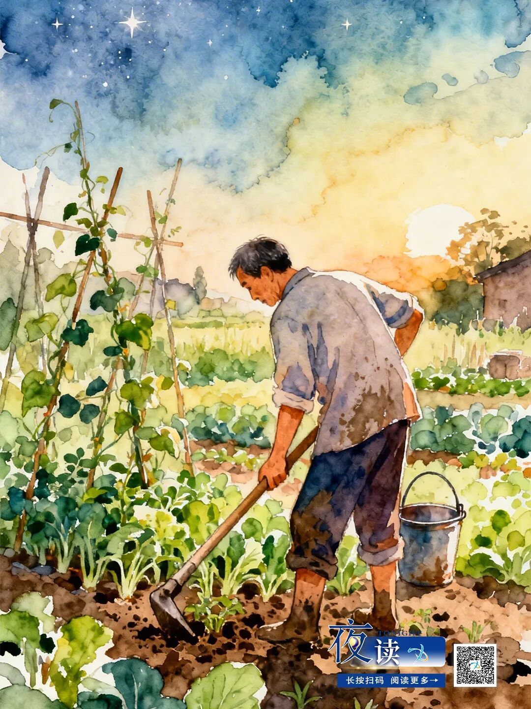 父亲一生清贫,安于节俭,任劳任怨。为了全家,每天清晨俺还在睡梦中,满天的星星还眨着眼睛,父亲就早早地去自留地里整理菜畦,要么为菜地划锄松土,要么为蔬菜整枝薅草,要么施肥浇水。当俺起床准备上学时,父亲身上带着露水或泥土才赶回家,尔后帮着母亲做饭,吃过早饭后再去生产队干活,把自己的辛苦和汗水都倾注到土地上。