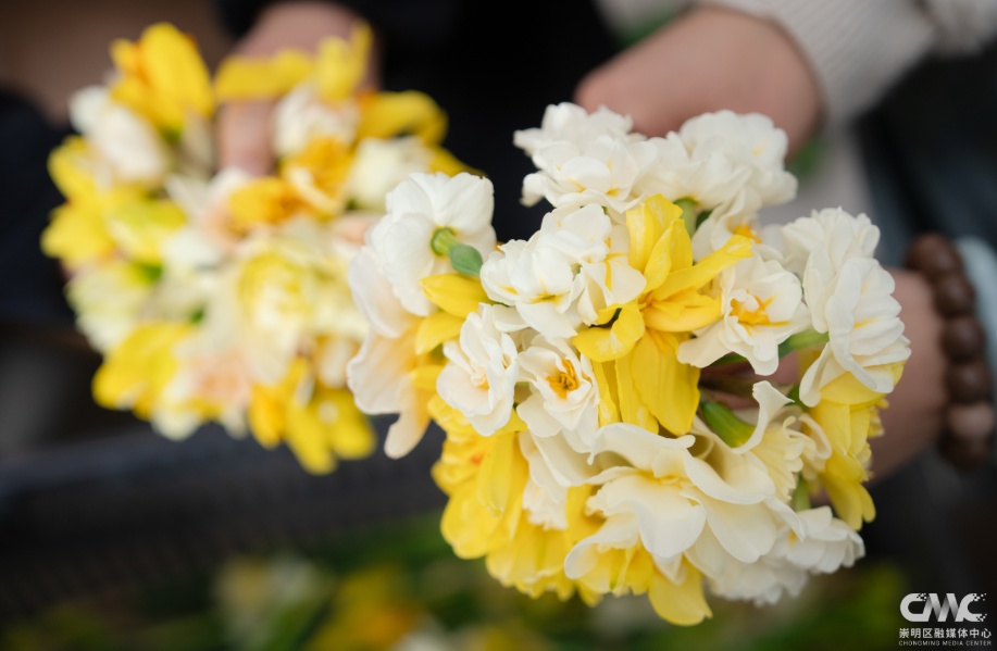 在花田间,工人们手持锋利的竹片和剪刀,小心翼翼地剪下一支支含苞待放的洋水仙,稍作修剪后捆扎成束,准备供应市场。目前,合作社主要销售洋水仙鲜切花,方便市民插瓶观赏。崇明百叶水仙花专业合作销售经理丁思庆介绍,洋水仙鲜切花以10支为一把进行销售,主要渠道包括盒马和淘宝等线上平台。“养护起来非常方便,只要用自来水插瓶,每三到五天换一次水就可以了。”这种低维护成本的观赏方式,受到不少城市消费者的欢迎。