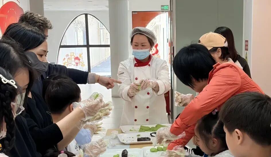 “揉一揉、捏一捏,馅料别放太多,收口要紧实……”谨斜居委会的社区食堂里,暖意融融。食堂师傅端来新鲜翠绿的艾草汁、细腻的糯米粉、香甜的豆沙、咸香的肉松馅料,围着案板教居民包青团。年纪稍长的阿姨们手法娴熟,主动当起“老师”,带着新手揉粉、裹馅、搓圆,你一言我一语聊着家常。另一边,天龙、宛南“生活盒子”里,亲子搭档格外热闹,爸爸妈妈牵着孩子的小手,跟着师傅学调配粉团、融合艾草汁,稚嫩的小手跟着大手慢慢揉捏,一个个圆滚滚的青团成型,藏着春日的清甜,也裹着亲子间的温情。