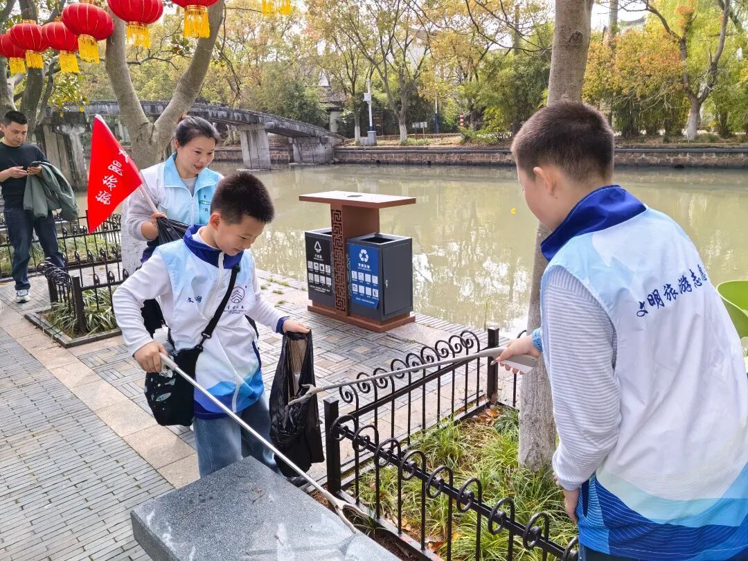 掌握相关环保知识后,亲子家庭组成志愿小队,穿上志愿者马甲,手持垃圾夹、垃圾袋与文明劝导宣传册,从迎祥桥出发,沿着指定路线前行。大家一边漫步欣赏古桥错落、碧水环绕的桥乡美景,一边俯身细致捡拾路边、草丛、桥畔的烟头、矿泉水瓶、纸屑等生活垃圾。小志愿者们认真专注,家长们耐心配合,大手牵小手默契协作,将散落的垃圾逐一清理干净。
