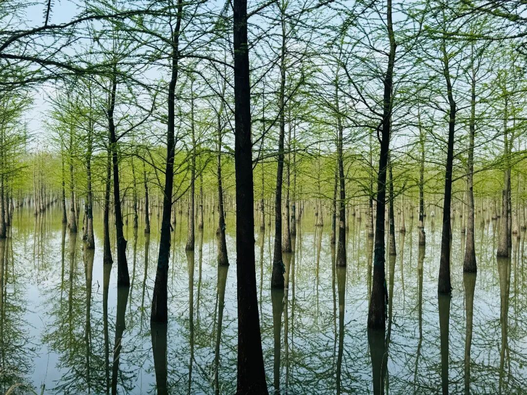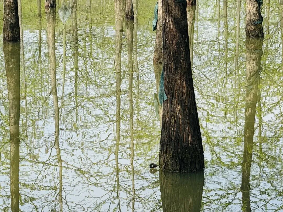 然而,当记者沿着滨水区域一路察看时,在水面上果然发现了地笼网,网体半浮于水面,看起来存在已久,水中央的水杉树上还挂着破败的白色网线。