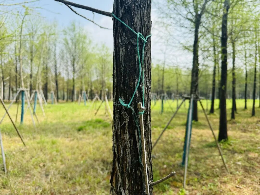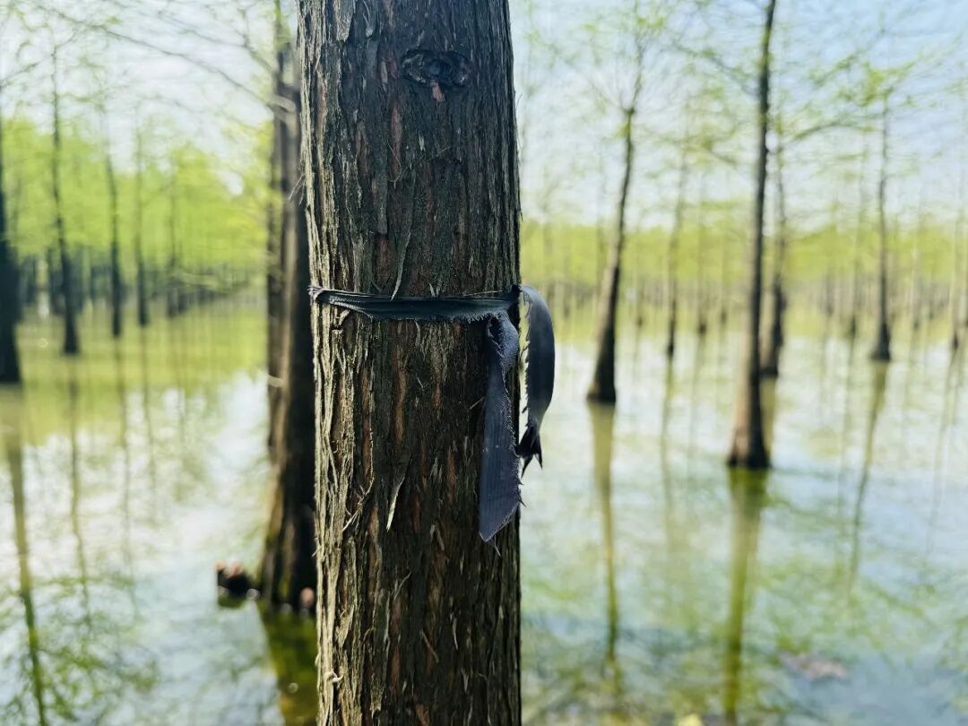 而在岸边的树上,记者也有发现。一棵树上挂着残存的捕鸟网,与之相邻的几棵树上也存有木条、布带和麻绳等,侧面证明这里确实有人放置过捕鸟网,意图捕捉野生鸟类。