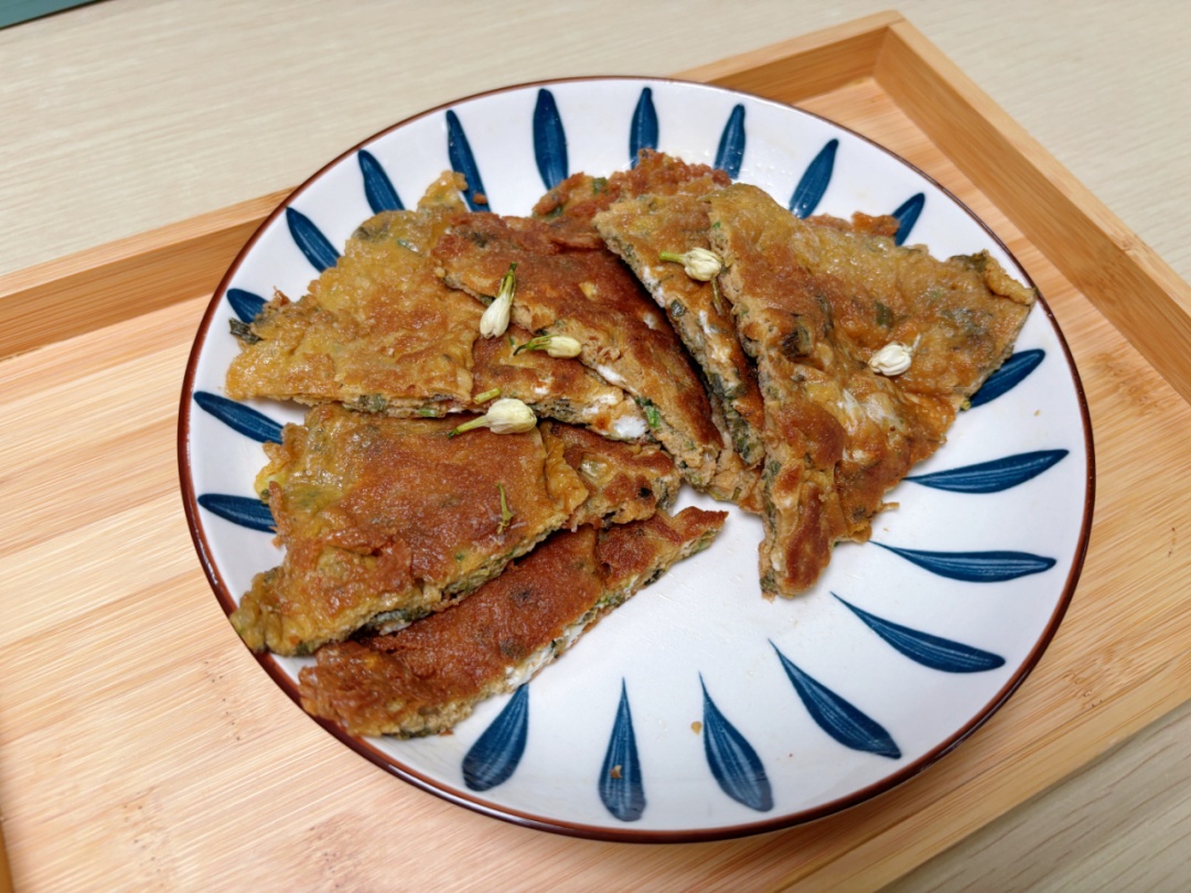 3.热锅冷油,倒入香椿鸡蛋液,煎至两面金黄。