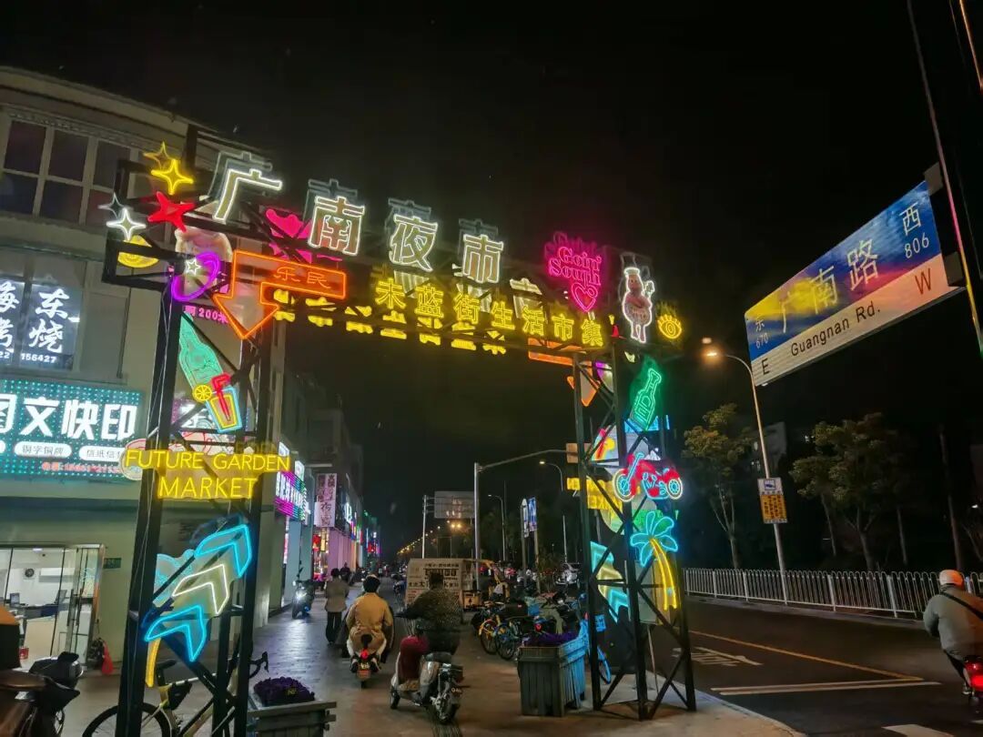 傍晚时分,吴泾镇广南路与虹梅南路的交叉口,拱门上的一盏盏霓虹灯准时亮起,将吴泾这条大隐隐于市的广南路渲染得格外有温度。一个月前,这里新开业了一家夜市,90平方米的室内小天地,9个摊位错落排布,店内烟火气和店外的喧嚣,伴随着夜幕降临,升腾起人间的至味清欢。