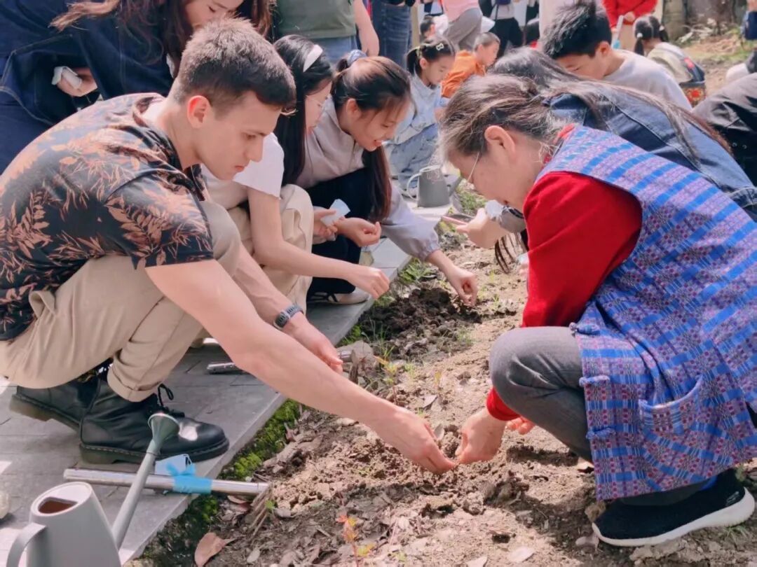在令人期待的“都市棉田”春播环节中,此次春播的棉种由新疆喀什巴楚县、海南中国农业科学院棉花研究所国家野生棉种质资源圃、上海市农业生物基因中心提供。在非遗代表性传承人带领下,华东理工大学留学生与徐汇区青少年活动中心的孩子们手持小铲,弯腰松土、点种覆土、浇水培土,动作认真而虔诚。