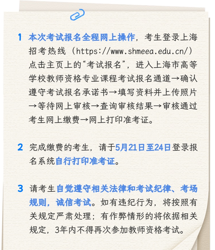 据市教育考试院介绍,2026年上半年上海市高等学校教师资格专业课程考试将于5月24日(星期日)举行,现将报名工作有关事项公告如下。