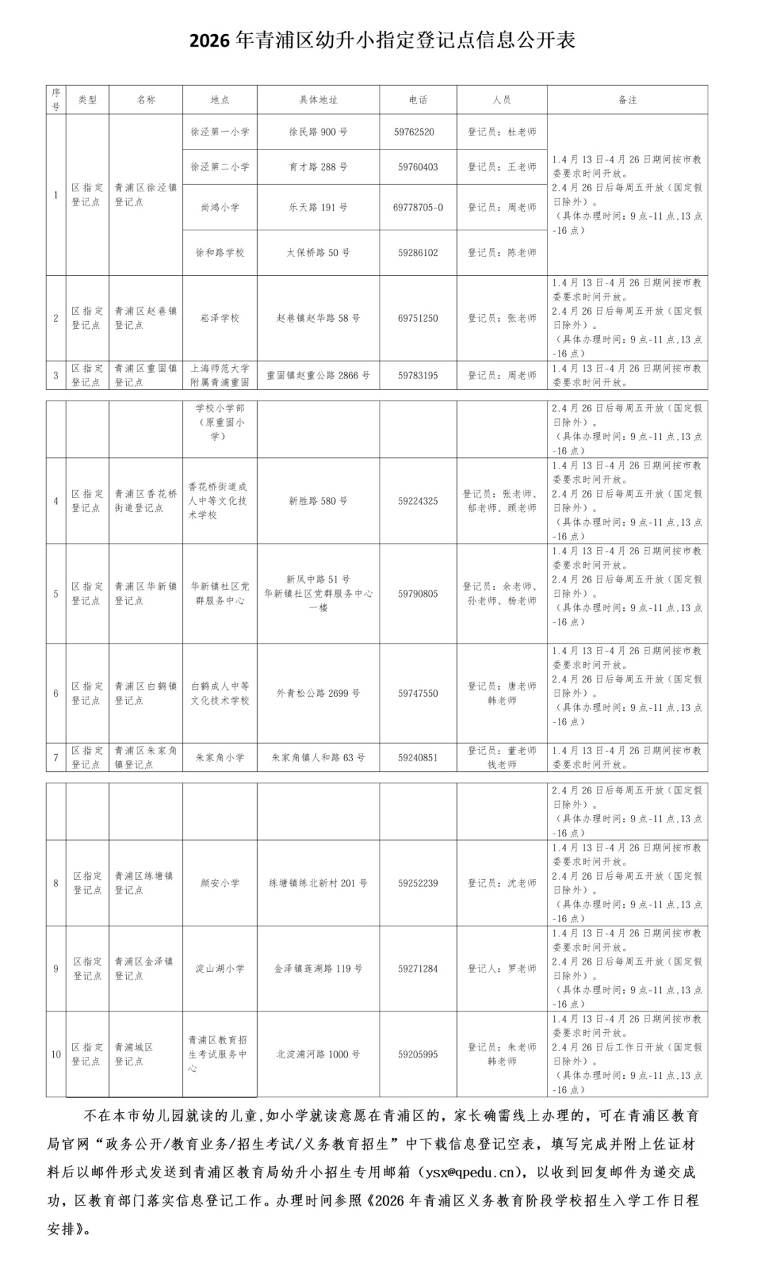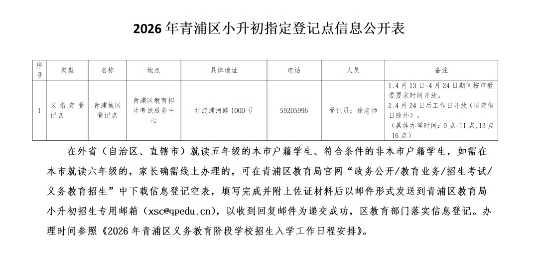 《上海市教育委员会关于2026年上海市义务教育阶段学校招生入学工作的实施意见》(沪教委基〔2026〕9号)文件精神,为促进依法办学、规范义务教育阶段学校招生入学工作,制定了《2026年青浦区义务教育阶段学校招生入学工作实施方案》。 小学阶段招生 1.入学信息登记。适龄儿童家长可凭“一网通办”或“随申办”实名账号登录“上海市义务教育入学报名系统”,查询入学信息,进行在线报名。 2026年小学阶段招生入学对象为:2019年9月1日-2020年8月31日出生,年满6周岁的儿童;确因身体状况等特殊原因不能当年度入学的,可向青浦区教育局基础教育科申请推迟一年入学。上一年度符合入学条件但因身体状况等特殊原因未入学的,可向区教育局基础教育科提出入学申请。 4月13日至4月26日,在园适龄儿童家长通过幼儿园登记儿童入学信息,未入园适龄儿童家长通过区教育局指定方式登记儿童入学信息,获取《上海市小学入学信息登记表》和“入学报名告知书”,作为入学报名的重要依据。 2.公民办小学入学报名。符合入学条件的适龄儿童家长,须在“一网通办”网站义务教育入学专栏或“上海市义务教育入学报名系统”进行入学报名,选择“公办小学报名”或“民办小学报名”。其中,公办小学报名时间为5月7日至5月11日,民办小学报名时间为5月7日至5月9日。 3.公办小学入学方式。本区所有公办小学坚持“免试入学”原则,采取户籍地段对口、居住地段对口或“电脑派位”等方式安排学生入学。根据2026年青浦区公办小学招生划片范围及青浦区义务教育阶段学校安置细则,由各校对区教育局下发的新生名单和材料进行核对验证,在此基础上开展招生入学工作。 4.统筹居住地入学。根据本市有关规定,继续做好本市户籍“人户分离”适龄儿童居住地登记入学工作。具有本市户籍的适龄儿童确有困难不能在户籍地入学的,凭有效期内《本市户籍人户分离人员居住登记凭证》,申请居住地登记入学(截止日为4月26日)。结合本区实际,继续实行本市户籍“人户分离”适龄儿童按居住地登记入学招生的实施细则,先安排户籍地与实际居住地一致的适龄儿童就近入学,再在区域内统筹安排“人户分离”适龄儿童入学。4月7日,公布本市户籍“人户分离”适龄儿童入学实施细则。 本市户籍的集体户口适龄儿童参照居住地登记入学办法就读。本市户籍居住廉租房的适龄儿童可凭户口簿及相关居住证明在廉租房所在地登记入学,由区教育局安排就近入学。 5.来沪人员随迁子女入学。各校要在教育局的统筹安排下,根据有关要求,切实做好来沪人员随迁子女招生入学工作。 根据《上海市人民政府办公厅转发市教委等四部门关于来沪人员随迁子女就读本市各级各类学校实施意见的通知》(沪府办规〔2018〕5号)等要求,2026年来沪人员适龄随迁子女需在本市接受义务教育的,适龄儿童须持有效期内《上海市居住证》或《居住登记凭证》,父母一方须持有效期内《上海市居住证》,且一年内(2025年7月1日至2026年6月30日)参加本市职工社会保险满6个月(不含补缴)或连续3年(从首次登记日起至2026年6月30日)办妥本市灵活就业登记。 6.公办小学验证。5月17日至5月21日为本市统一的公办小学第一批验证。区教育局指定的报名验证点主要通过集中调取“一网通办”有关信息,对已完成公办小学报名的适龄儿童以及家长的证件进行核对。“一网通办”网站或“随申办”中的电子证照与纸质证件同等效力使用。 本市户籍的儿童,家长须提供户口簿、《上海市小学入学信息登记表》,在居住地登记就读的还须提供有效的《本市户籍人户分离人员居住登记凭证》)、房产证或廉租房相关材料等。 非本市户籍的儿童,家长须提供户口簿、《上海市小学入学信息登记表》、父母一方有效的《上海市居住证》、参加本市职工社会保险证明或《就业创业证》(或《就业失业登记证》),以及适龄儿童本人的合法居住证件。 区教育局指定的报名验证点要对登记就读一年级的来沪人员随迁子女及其父母的有关证件和有效期限进行核对,通过信息系统对来沪人员随迁子女父母参加本市职工社会保险、灵活就业登记证明进行信息比对。 5月22日起,对已验证通过的适龄儿童,陆续发送公办小学入学告知信息。未被民办小学录取的,参加公办小学第二批验证,时间为5月30日至5月31日。 本区户籍中重度智力障碍及伴有脑瘫、自闭症、言语障碍等多重残疾的适龄儿童,完成网上信息登记后可联系青浦区特教指导中心咨询及备案(联系电话:021—59230624),经评估后,安排进入相应学校就读。 初中阶段招生 1.小学毕业信息核对。4月13日至4月24日,各校要在区教育局的统筹安排下,有序组织本市户籍和符合条件的非本市户籍小学五年级学生家长对“上海市义务教育入学报名系统”中的户籍地址、居住地址等入学相关信息进行核对,并填写监护人手机号码(作为接收初中入学信息的联系方式),如发现有关信息与实际情况不符,家长应及时凭有效证件通过学生就读小学进行更正。同时,组织民办一贯制学校征求本校学生直升意愿。4月24日为本市小学五年级学生初中入学相关信息核对、更正截止日。 2.回户籍(居住)地就读。跨区就读的本市户籍小学五年级学生,毕业后可在学籍所在区就读初中,也可根据实际情况申请回户籍(居住)地所在
