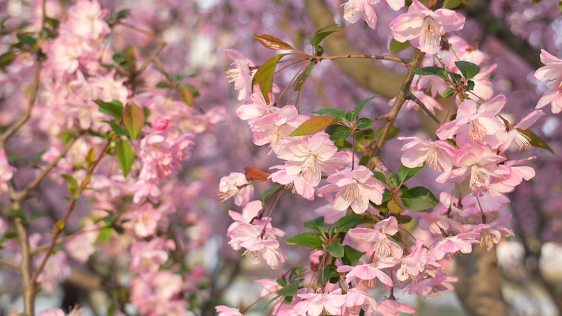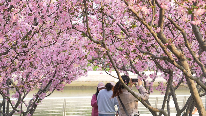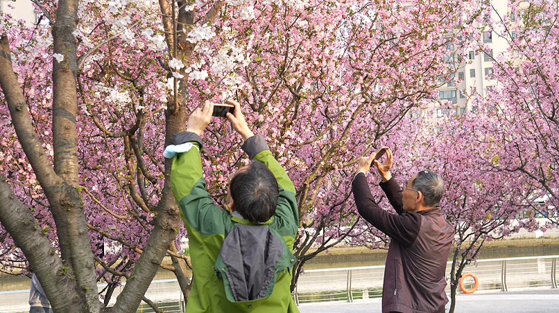 眼下,半马苏河公园内海棠花正值盛放期,粉嫩的花瓣层层叠叠,吸引了大批市民游客。粉白色的花朵密密匝匝缀满枝头,有的含苞待放,有的已然舒展,在春风中轻轻摇曳。目前正值盛花期的是垂丝海棠,后续北美海棠、湖北海棠等也会相继绽放、装点河畔绿地。