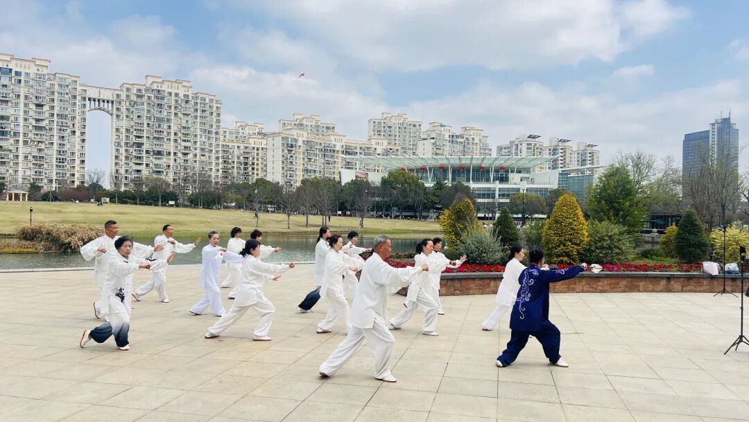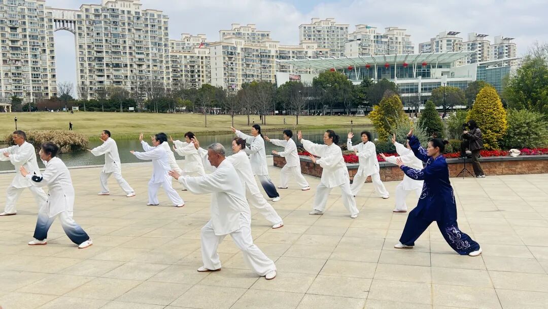 整齐划一的动作、从容平和的神态,吸引了不少周边散步的居民驻足围观,大家纷纷拿出手机记录,并不时发出赞叹与掌声。不少居民在感受到太极拳的魅力后,主动加入到习练队伍中,跟着学员们一起感受传统武术的魅力。