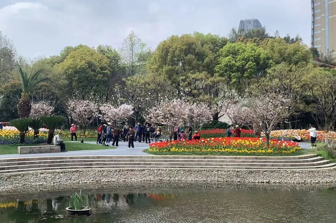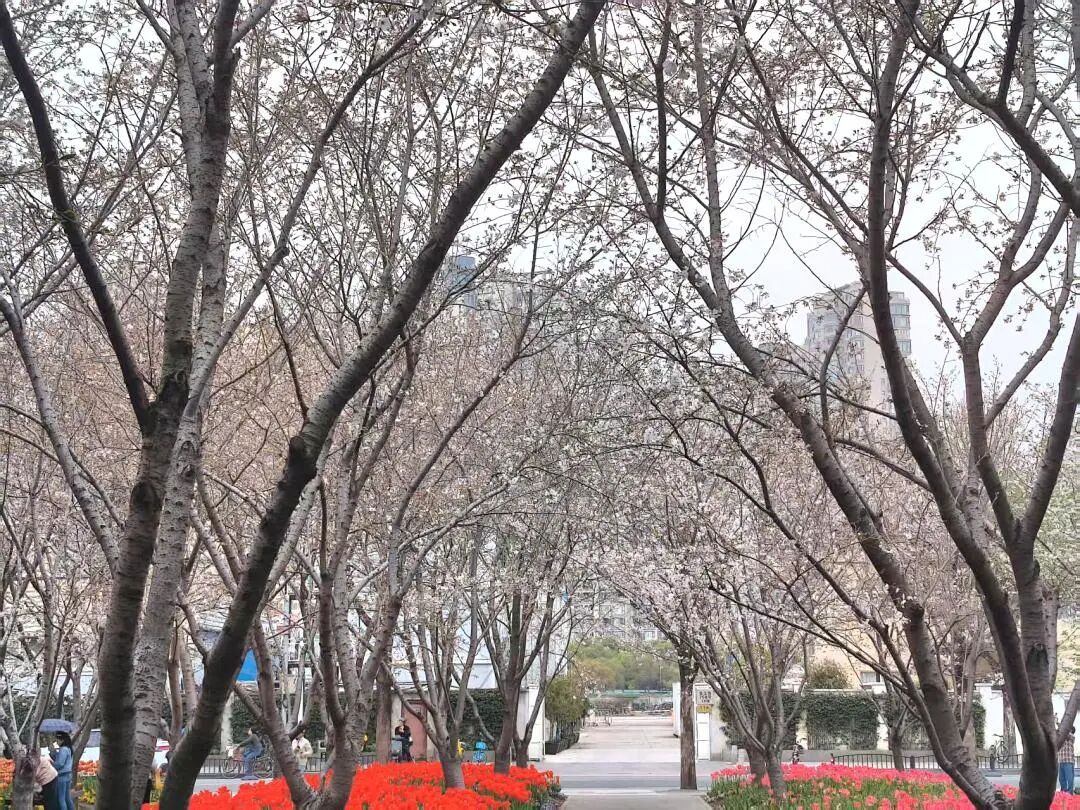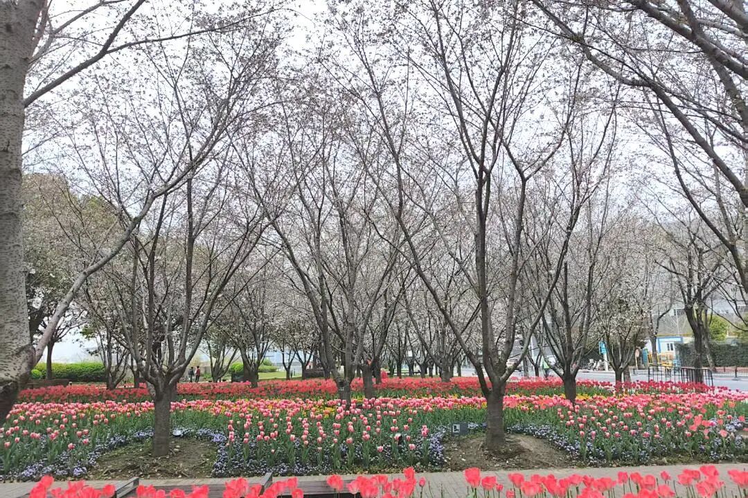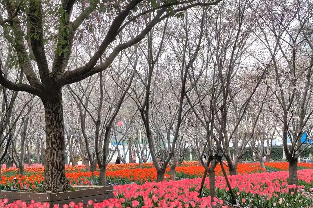 如果你想一次性看够两种春天,一定要来琴键春园。这里不仅有盛放的樱花,还有4000平方米的郁金香花海按色彩整齐排布,红的似火、粉的赛桃,像大自然按下的春日琴键。