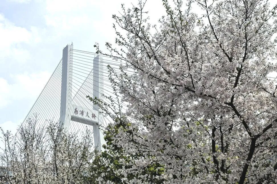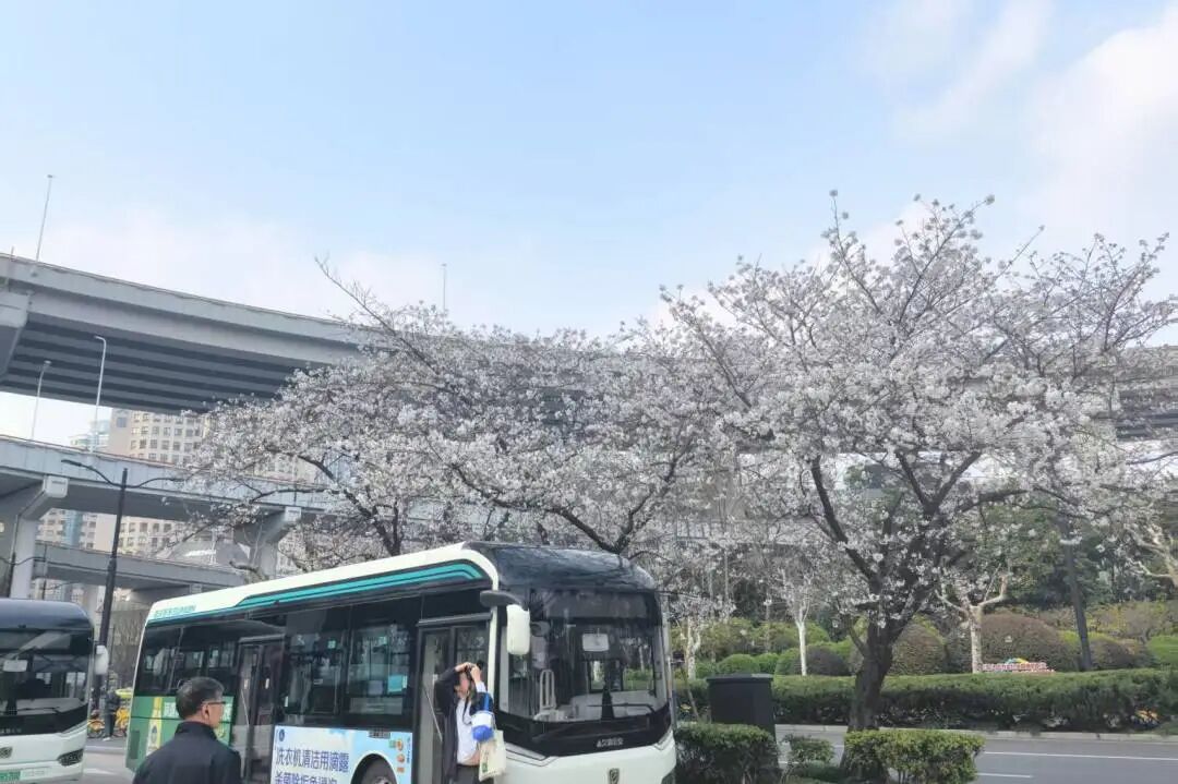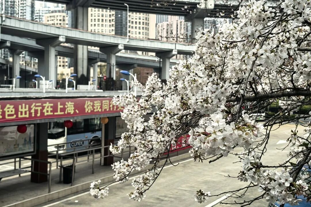 这里的樱花是1991年南浦大桥建成通车时栽下的。三十余年时光沉淀,让这里的樱花与穿梭的公交车、匆匆的通勤者相互映衬,成就了“最美樱花车站”的美名。
