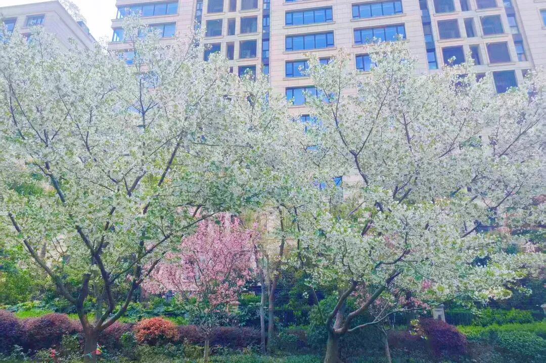 下午4点至5点,此时光线最为柔和,花园内的花境与粉色樱花交织,色调高级且自带电影感。