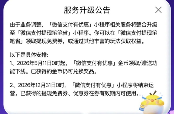 5月11日起,金币领赠功能下线,但已获得的金币仍可兑换奖品,已获得的提现免费券、优惠券在券有效期内可使用。