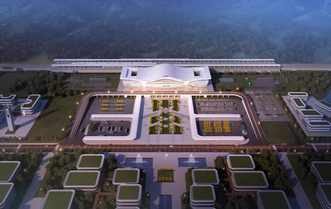 站房屋面采用网架结构,总重500吨,最大悬挑长度7.5米,最大跨度21米。站台雨棚宽12米长450米,采用混凝土结构,使用双柱雨棚。