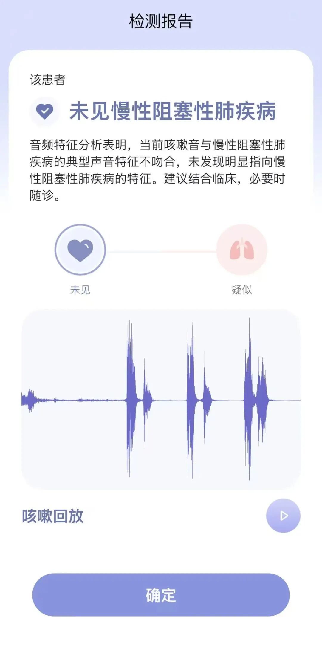 据介绍,该AI产品由上海交通大学、瑞金医院联合多家机构共同研发,它依托全球最大的呼吸数据化数据库,包含超3万例病例数据和40多万个音频片段,覆盖14岁-90岁不同年龄段的人群,10到20秒就能初步出具慢阻肺筛查结果。