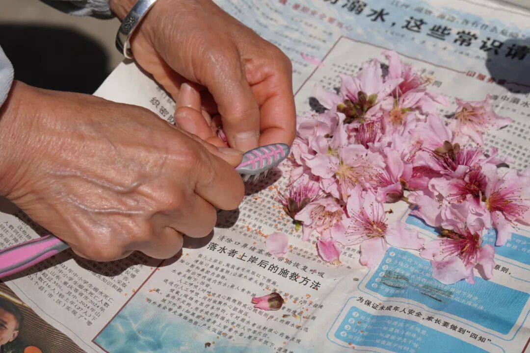 据介绍,疏花时,每根桃枝上只保留2到4朵花,这样才能保证枝头挂果、挂好果。那人工授粉的花粉从哪里来呢?毛桥村村民毛俊芳告诉记者,疏花时采下来的花苞,把里面的花籽轻轻拨出来,在阳光下晒一晒,装进瓶里就能使用。