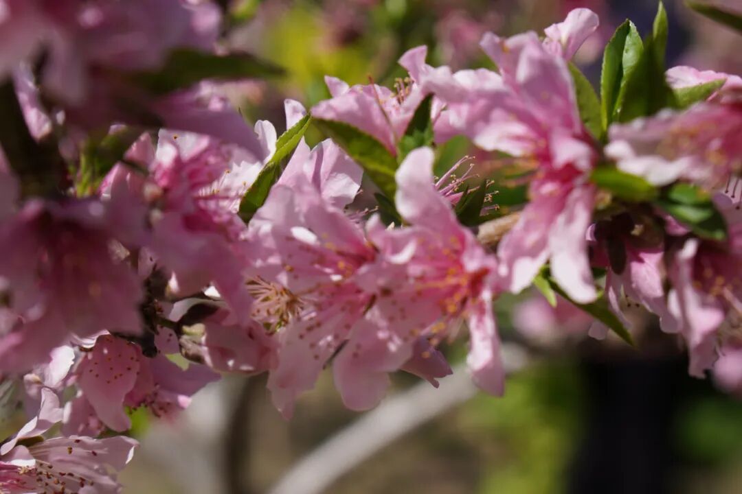 授粉是桃子坐果前最关键的一步。只有花粉顺利落到柱头上,小小的桃子才能在花蒂处悄然萌发。完成这一步,接下来就是疏果、套袋、施肥……静待花落、果熟。到时候,花瓣会慢慢褪去,小小的青桃将在枝头悄悄长大,在阳光雨露中一天天变得饱满圆润。