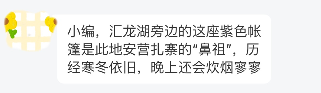 网友所说的地点,位于汇龙湖东面。刚到现场,记者就找到了那顶备受关注的紫色帐篷,帐篷上方还装着一顶烟囱,里面摆放着凳子、水壶、茶叶、杯子、矿泉水等生活用品,俨然成了一个“临时小家”。