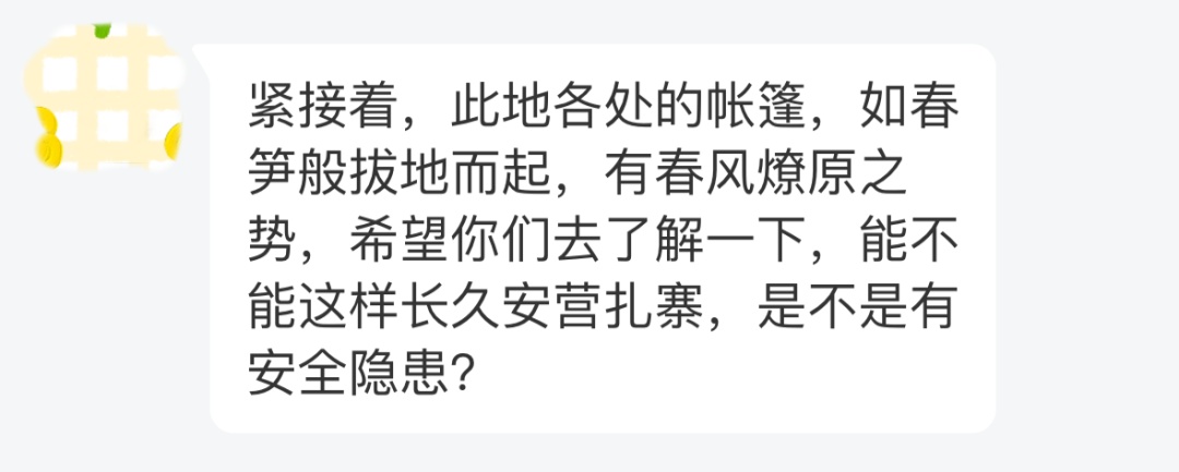 帐篷主人沈先生告诉记者,看到不少市民周末在此搭帐篷休闲,自己也就跟着过来,帐篷一搭就是半年,有空便和朋友过来小坐。冬天天冷时,他还会在帐篷内生火取暖。他表示,等天气转热就会自行收起帐篷;若相关部门有清理要求,也愿意配合拆除撤离。